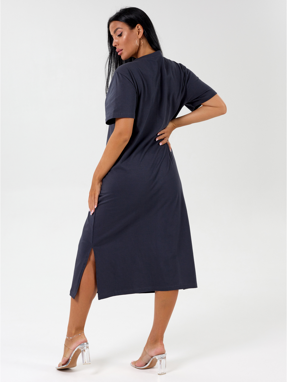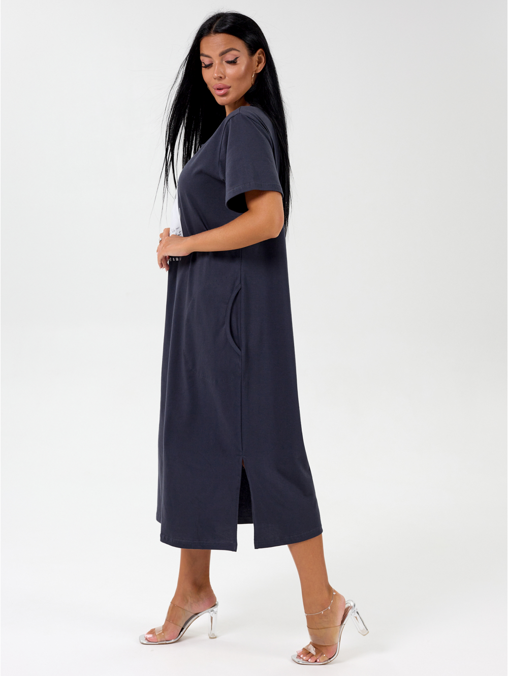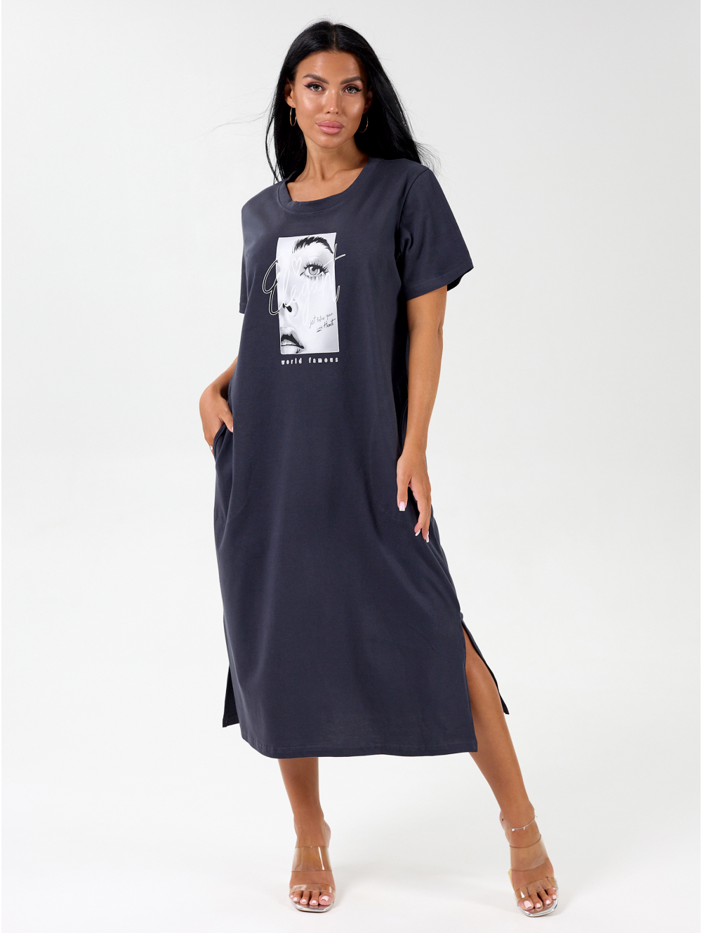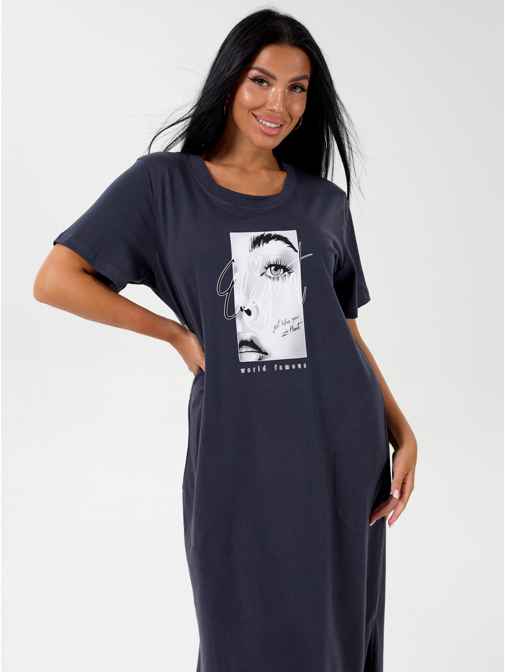 Удлиненное платье свободного кроя из хлопковой, мягкой ткани, с разрезами по бокам. На полочке имеется декоративный фотопринт, придающий изделию оригинальный вид.
