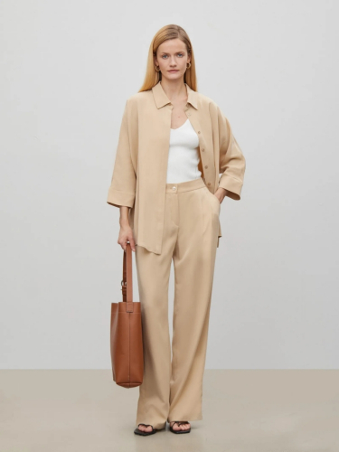 Брюки в песочном цвете из приятного к телу тенсела. Благодаря эластичной резинке сзади легко и комфортно садятся по фигуре. Модель с элегантными защипами дополнена прорезными карманами по бокам. Имеет прямой крой. Застёгивается на пуговицу и молнию. Брюки отлично дополнит рубашка из комплекта