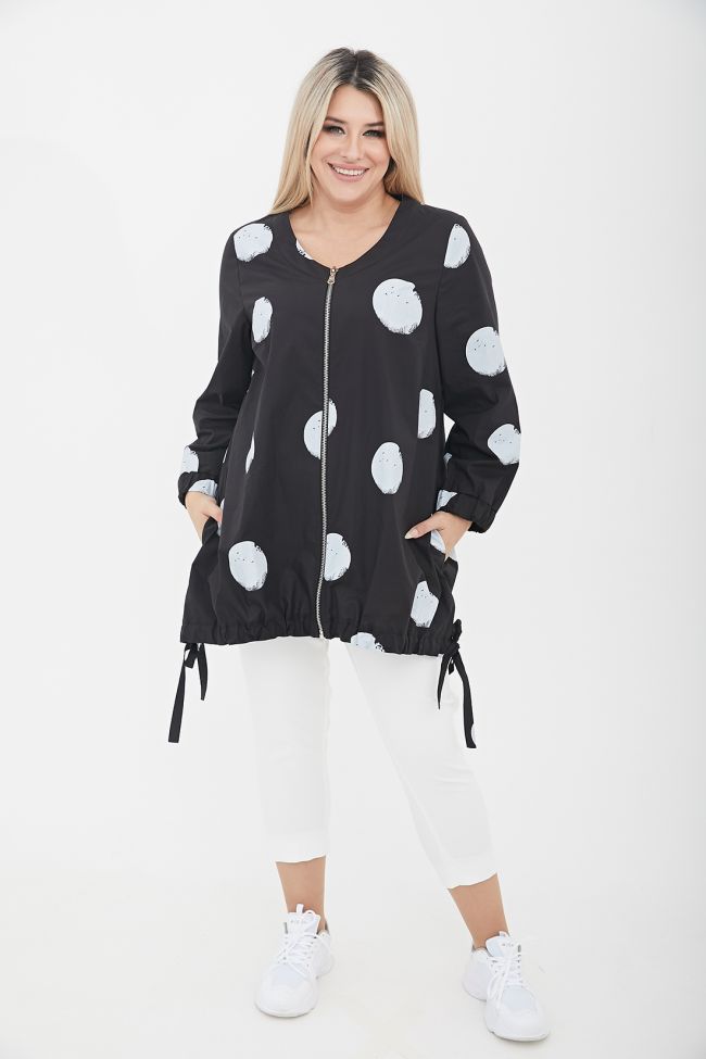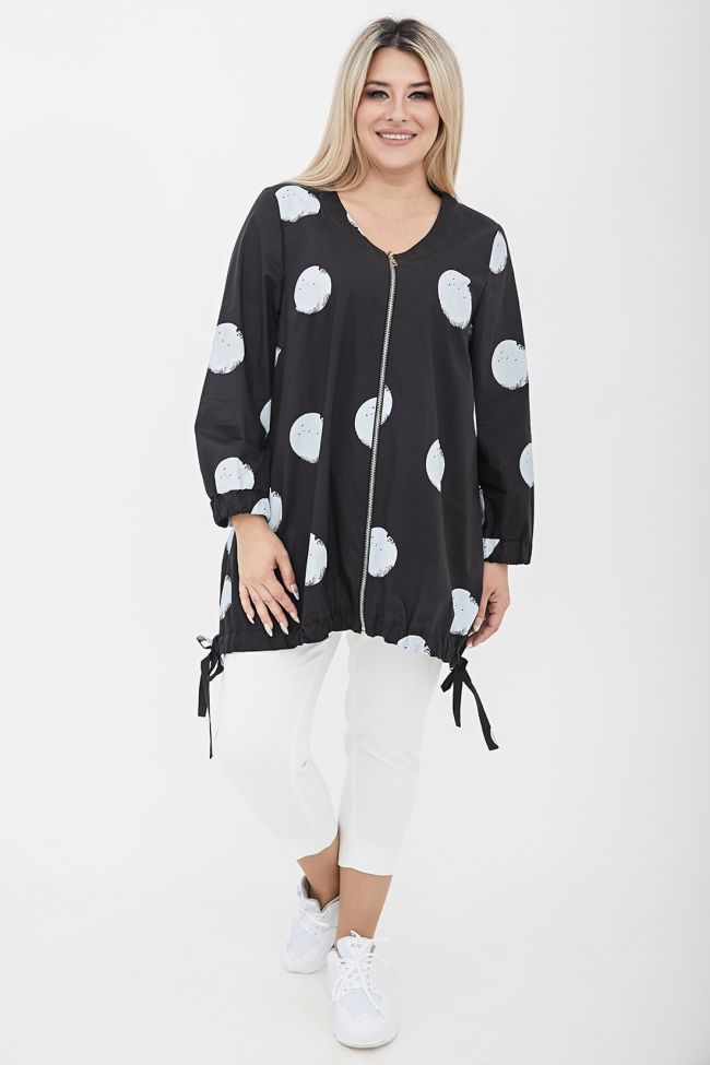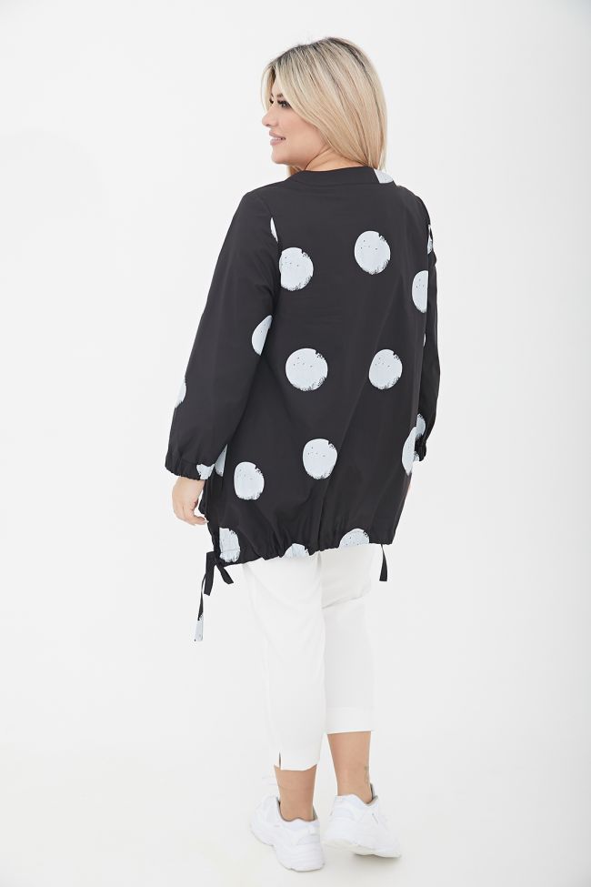 черный Свободная туника трапециевидного силуэта из поплина в принт "круги".  V - образный вырез горловины оформлен широкой обтачкой. По переду - центральная застежка на тесьму - молнию. Длинные втачные рукава, дополнены широкой манжетой на резинке. Модель с асимметричным низом - подчеркнутым притачной кулиской, по бокам разрезы с завязками. В боковых швах удобные карманы.