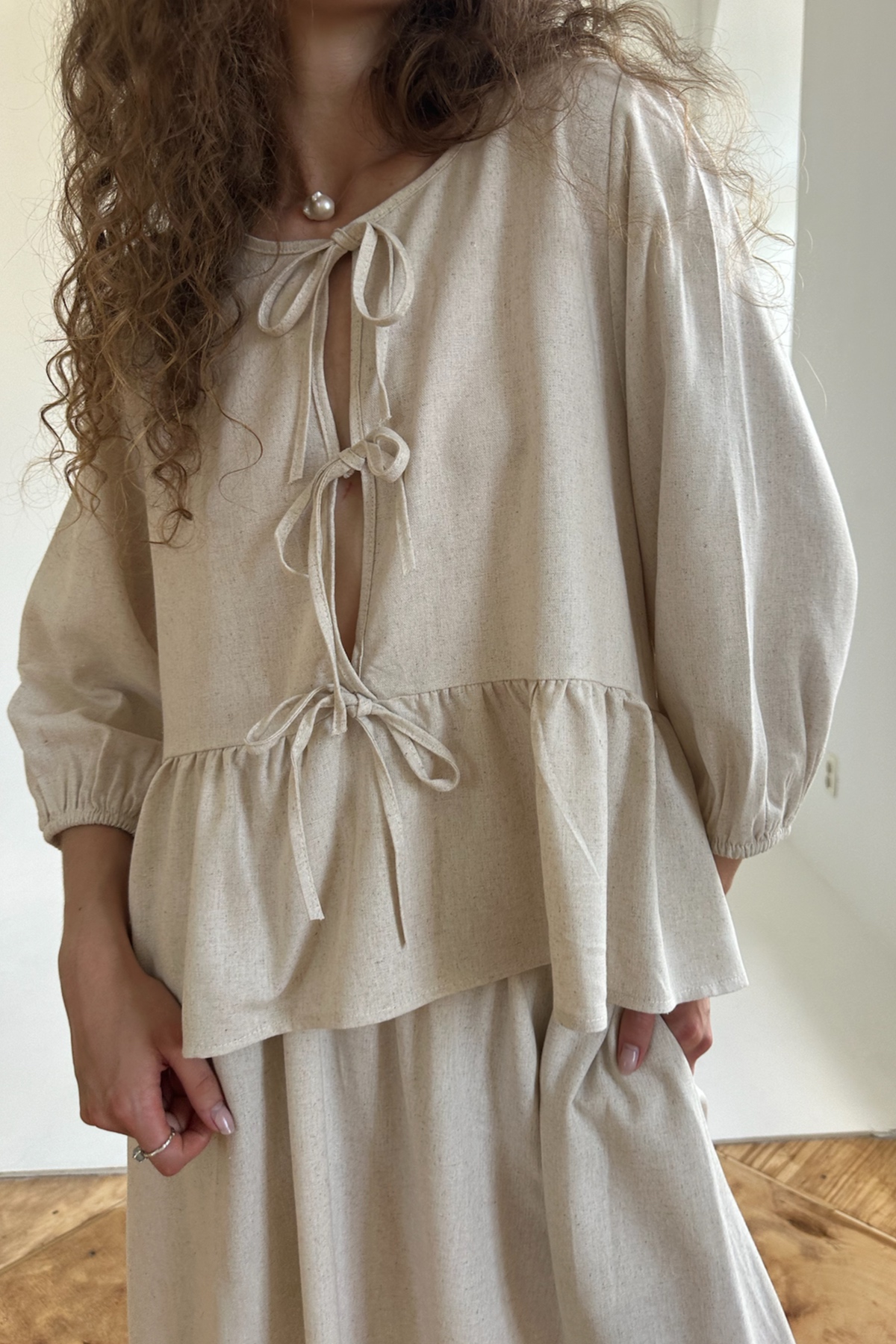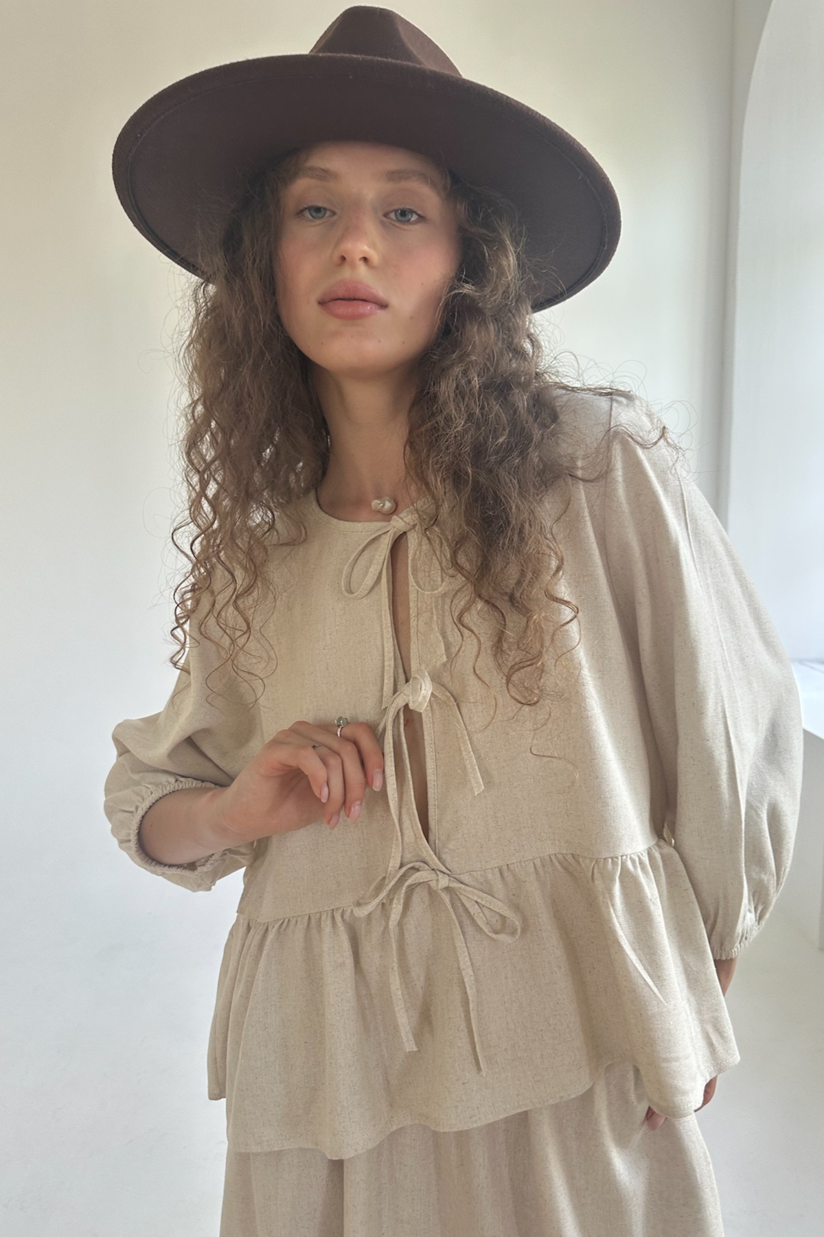 Блузка широкого кроя изо льна и хлопка с бантиками. Свободный крой блузки не стесняет ваши движения. Блузка идеально садится на любой тип фигуры. Все изделия уникальны и отшиваются небольшими партиями. Стирка изделий вручную либо использовать машинную стирку в деликатном режиме (не более 30 градусов).