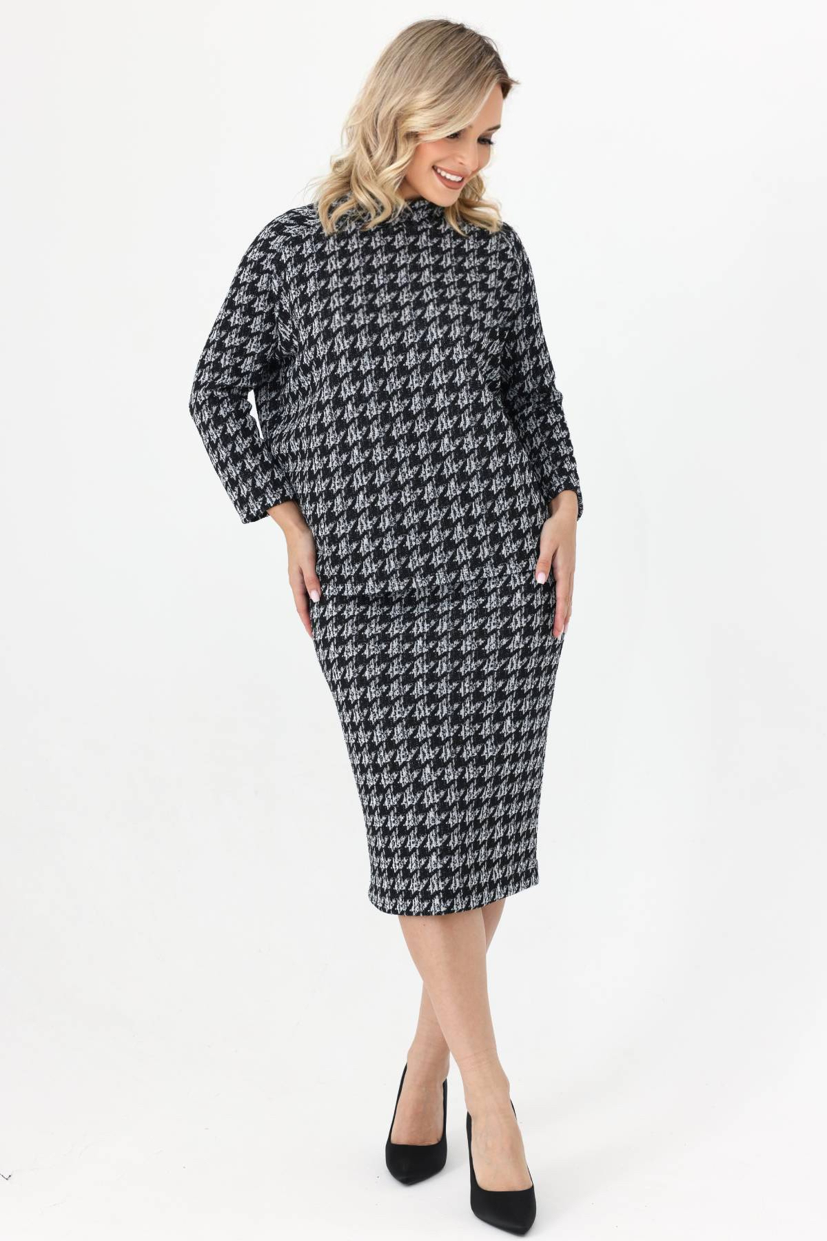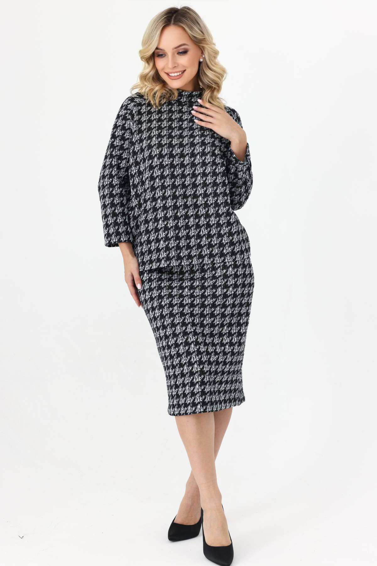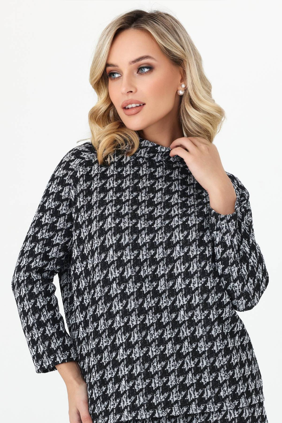 Блузка выполнена из буклированного трикотажа в стиле Шанель. Рукав-реглан. Материал приятен к телу, мягко ложится по любой фигуре, хорошо тянется, не мнется, не сыплется. Прямой свободный крой позволяет легко комбинировать эту модель женской блузки с разными вариантами низа. Дополняйте брюками или юбками в зависимости от повода, носите заправленной или навыпуск. Благодаря длине и продуманному крою блузка зрительно вытягивает силуэт и создает привлекательный женственный образ для торжественного случая или повседневности. Комфортная посадка дарит уверенность и ощущение свободы.