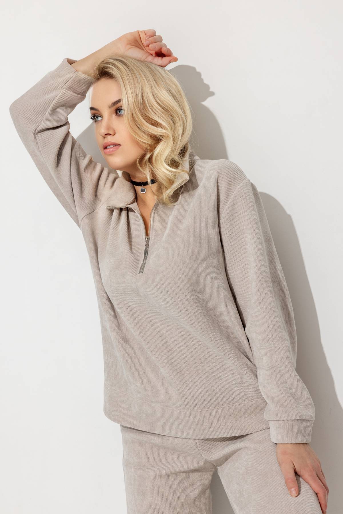 Блузка - толстовка из мягкого тактильно-приятного трикотажного вельвета. Хлопковая изнанка. Короткая функциональная молния из стойки. Блузка из хлопкового вельвета (можно собрать комплект с брюками артикул 153. К данной расцветке подходят  брюки арт.153/06). Материал - трикотажный вельвет приятен к телу, мягко ложится по любой фигуре, не вытягивается, не затирается в процессе эксплуатации.  Комфортная посадка дарит уверенность и ощущение свободы.