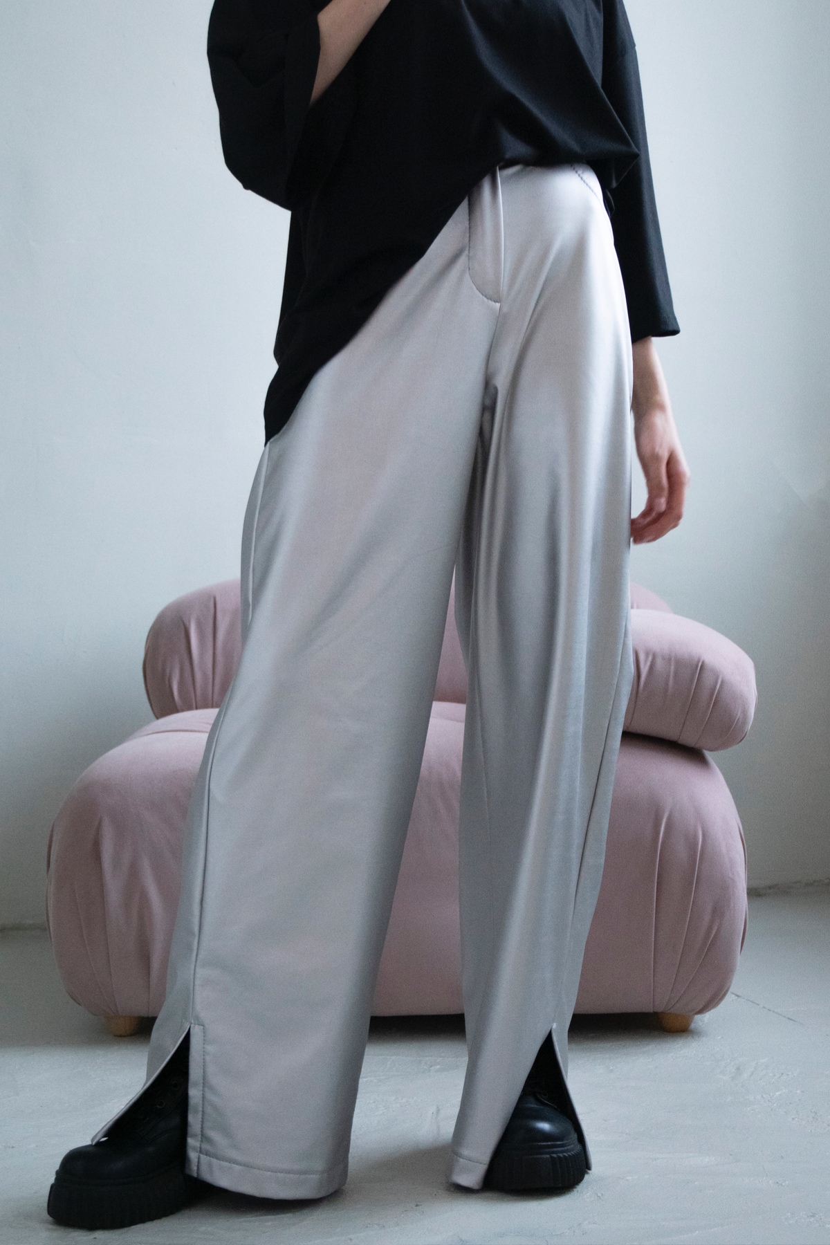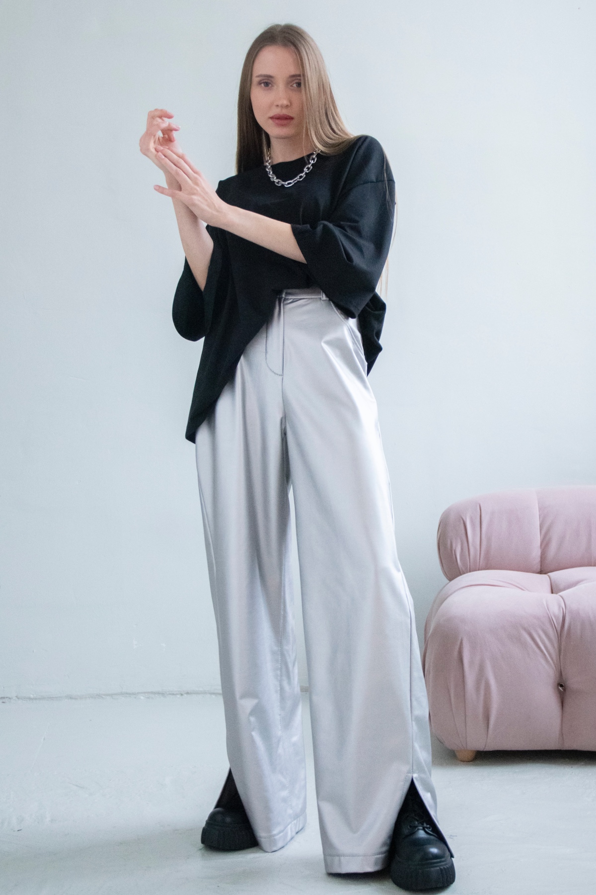 Брюки из эко-кожи широкого силуэта с задними карманами и разрезами внизу.