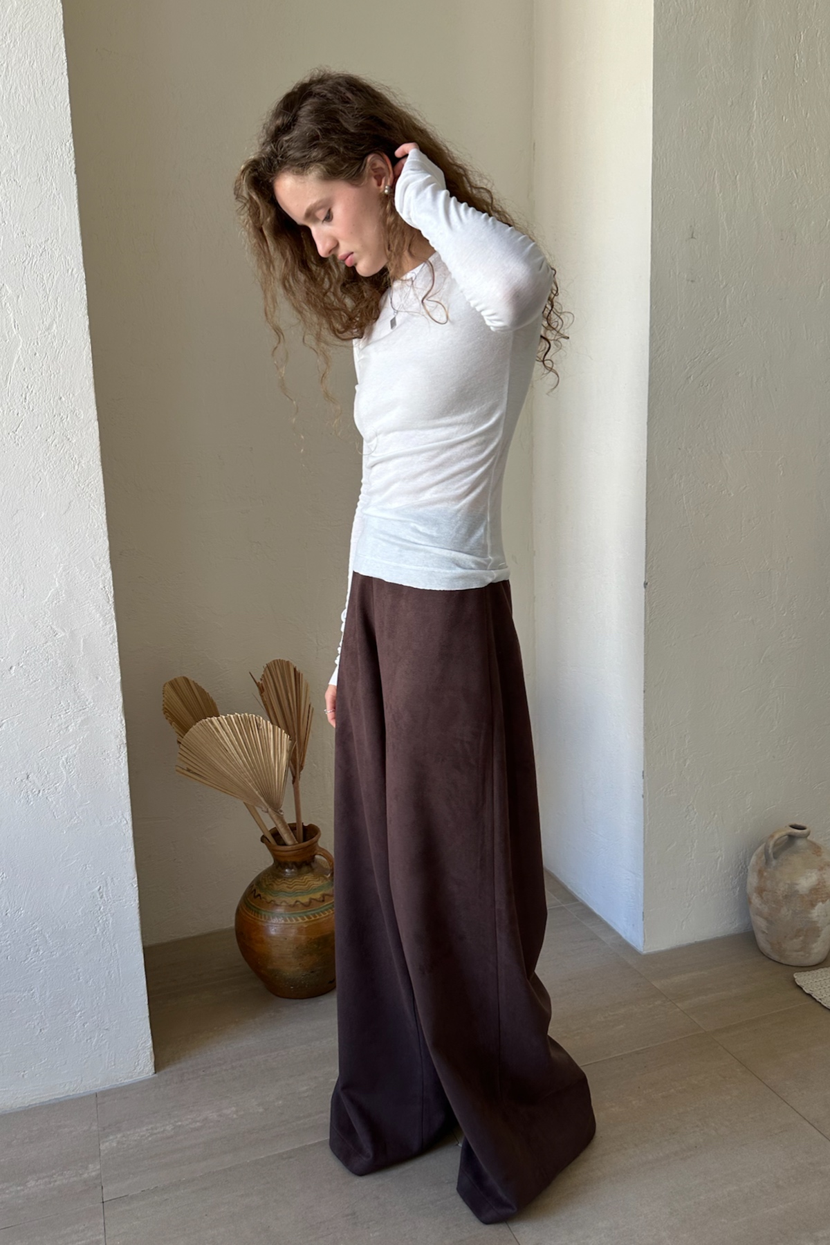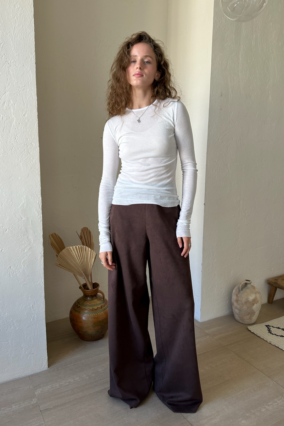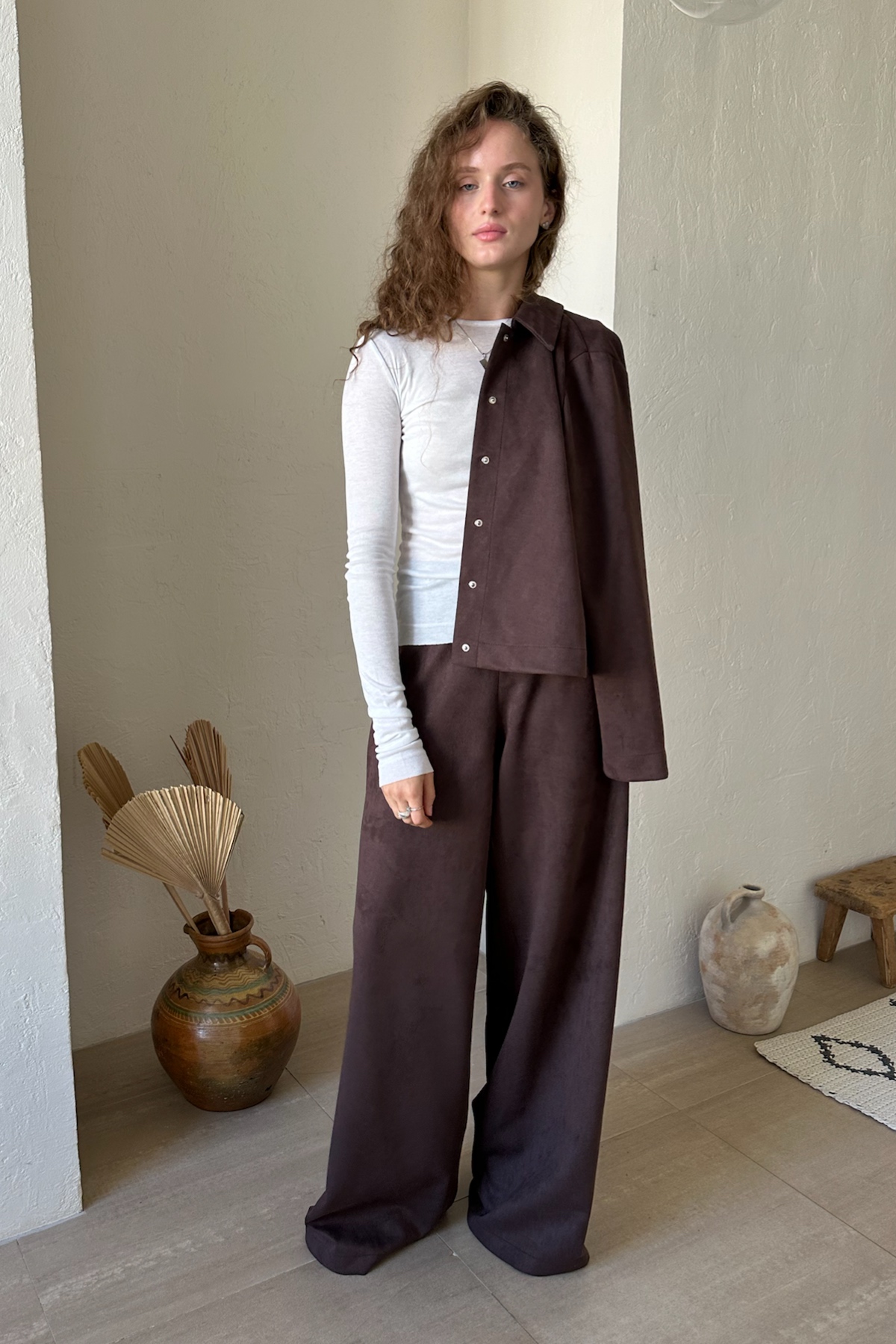 Брюки прямого силуэта из мягкой эко-замши. Подойдут для создания непринужденного городского образа. Брюки можно дополнить коротким топом или длинной рубашкой или блузкой. Такой комплект—идеальный  вариант для тех, кто ценит качество и минимализм.