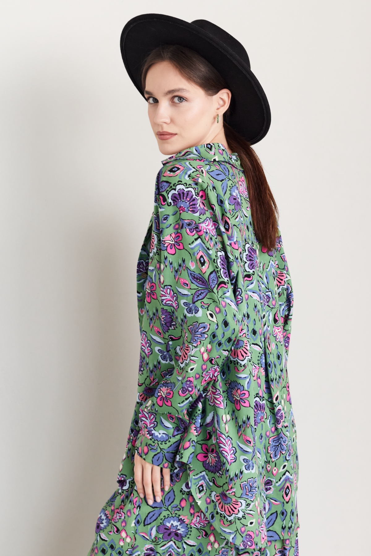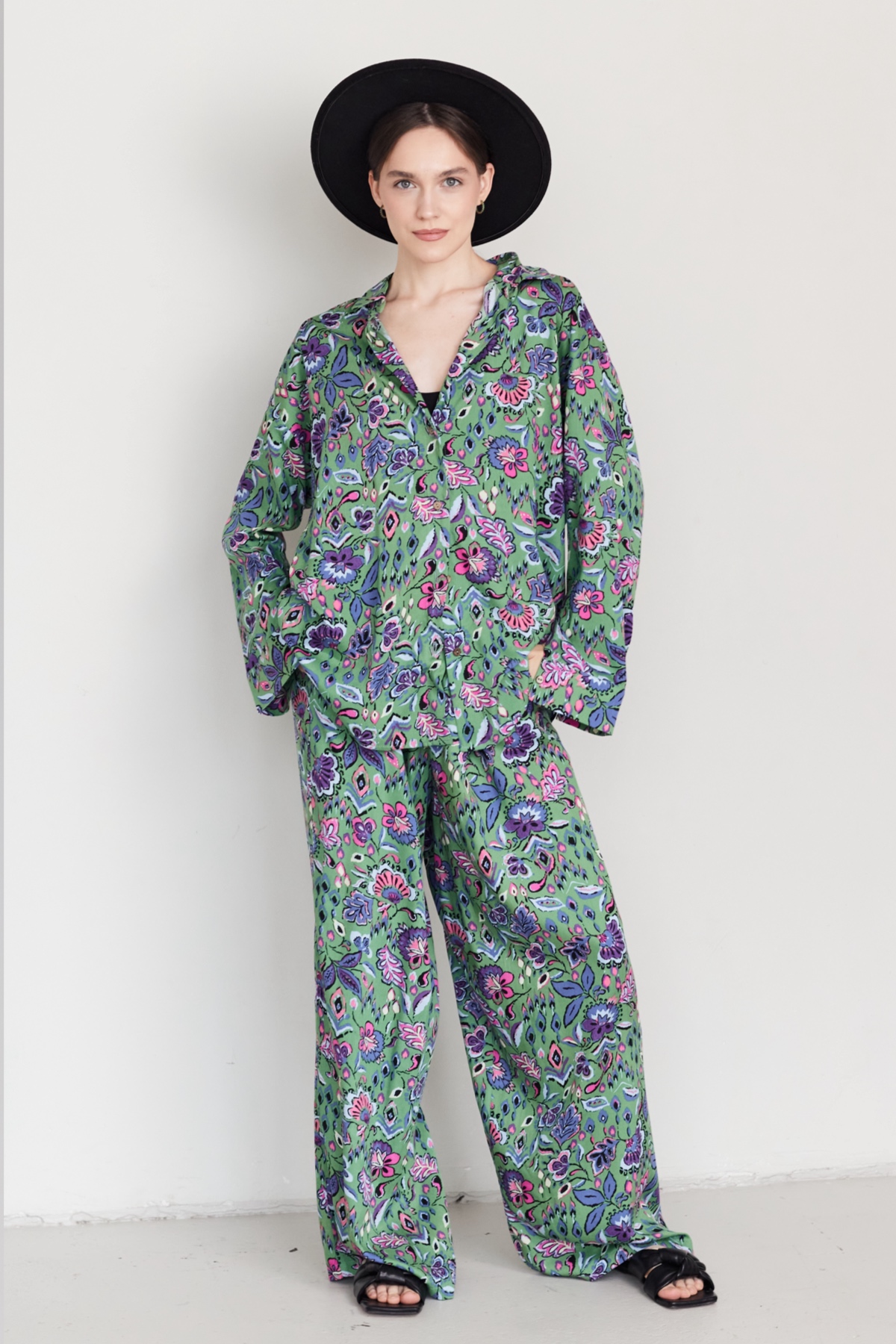 Тренд сезона! Стильный костюм с широкими брюками из 100% вискозы. Брюки с высокой линией талии, расширяются от пояса, карманы в боковом шве. Они прекрасно подчёркивают особенности женской фигуры. Длина изделия см. Рубашка удлиненная свободного кроя. Пуговицы сделаны из скорлупки кокоса. Длина изделия см. Для кроя костюма используются качественные лекала и премиум ткань, что опеспечивает ровную посадку по фигуре, удобство и практичность в уходе и долгую носку.