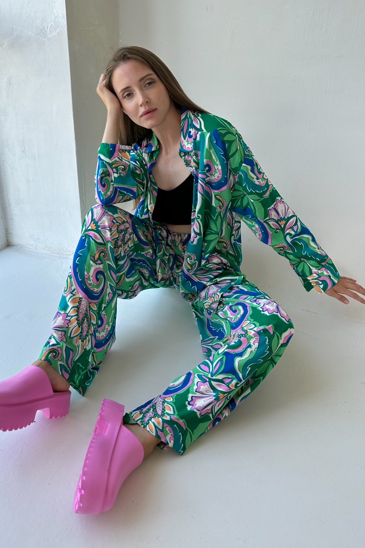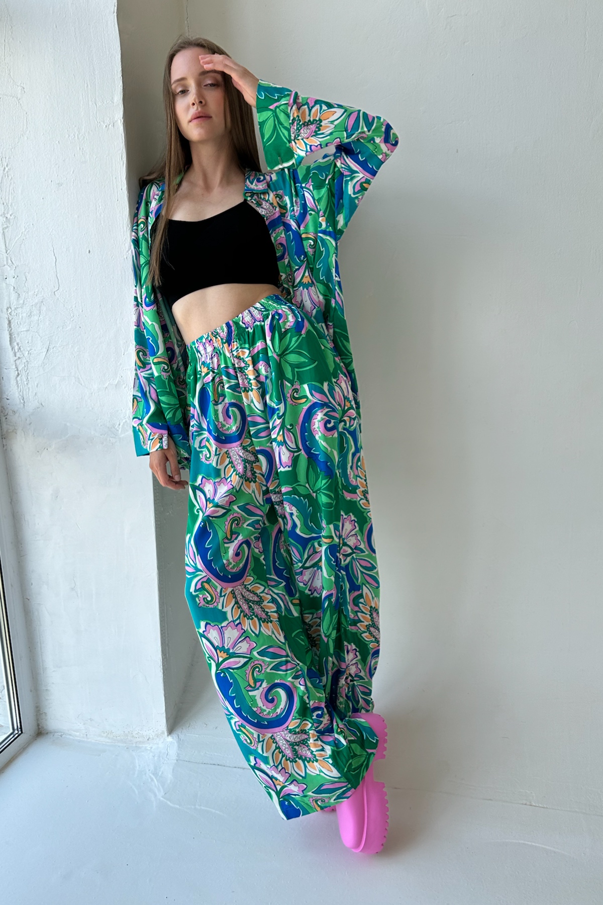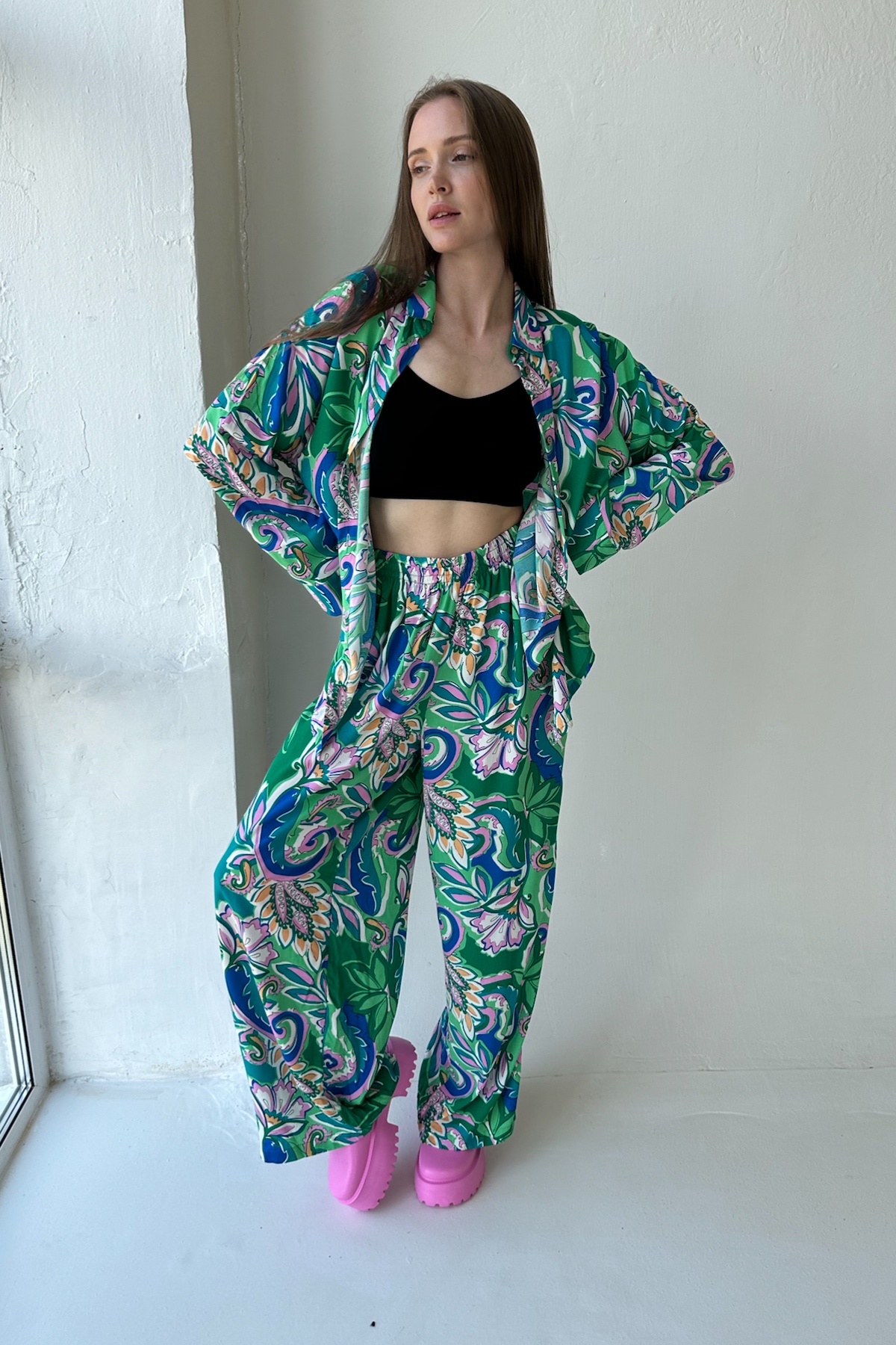 Тренд сезона! Стильный костюм с широкими брюками из 100% вискозы. Брюки с высокой линией талии, расширяются от пояса, карманы в боковом шве. Они прекрасно подчёркивают особенности женской фигуры. Длина изделия см. Рубашка удлиненная свободного кроя. Пуговицы сделаны из скорлупки кокоса. Длина изделия см. Для кроя костюма используются качественные лекала и премиум ткань, что опеспечивает ровную посадку по фигуре, удобство и практичность в уходе и долгую носку.
