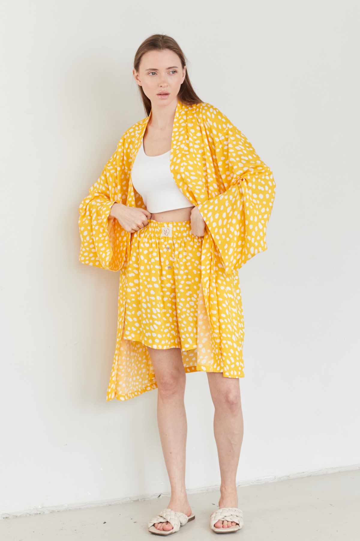 Тренд сезона! Стильный костюм кимоно с поясом и широкими шортами из 100% вискозы. Шорты с высокой линией талии, расширяются от пояса, карманы в боковом шве. Они прекрасно подчёркивают особенности женской фигуры. Кимоно удлиненное свободного кроя. Пуговицы на шортах сделаны из скорлупки кокоса.  Для кроя костюма используются качественные лекала и премиум ткань, что опеспечивает ровную посадку по фигуре, удобство и практичность в уходе и долгую носку.
