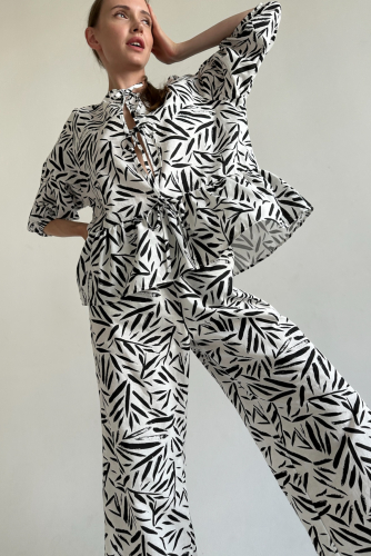 Все изделия имеют безупречный пошив и идеальную посадку. Костюм SET070 блузка с бантиками и брюками изо льна и хлопка. Свободный крой блузки и брюк не стесняет ваши движения, брюки немного укороченные с карманами (высокая посадка, на мягкой резинке, ручной работы) не давят и подходят беременным. Костюм идеально садится на любой тип фигуры. Все изделия уникальны и отшиваются небольшими партиями. Стирка изделий вручную либо использовать машинную стирку в деликатном режиме (не более 30 градусов).