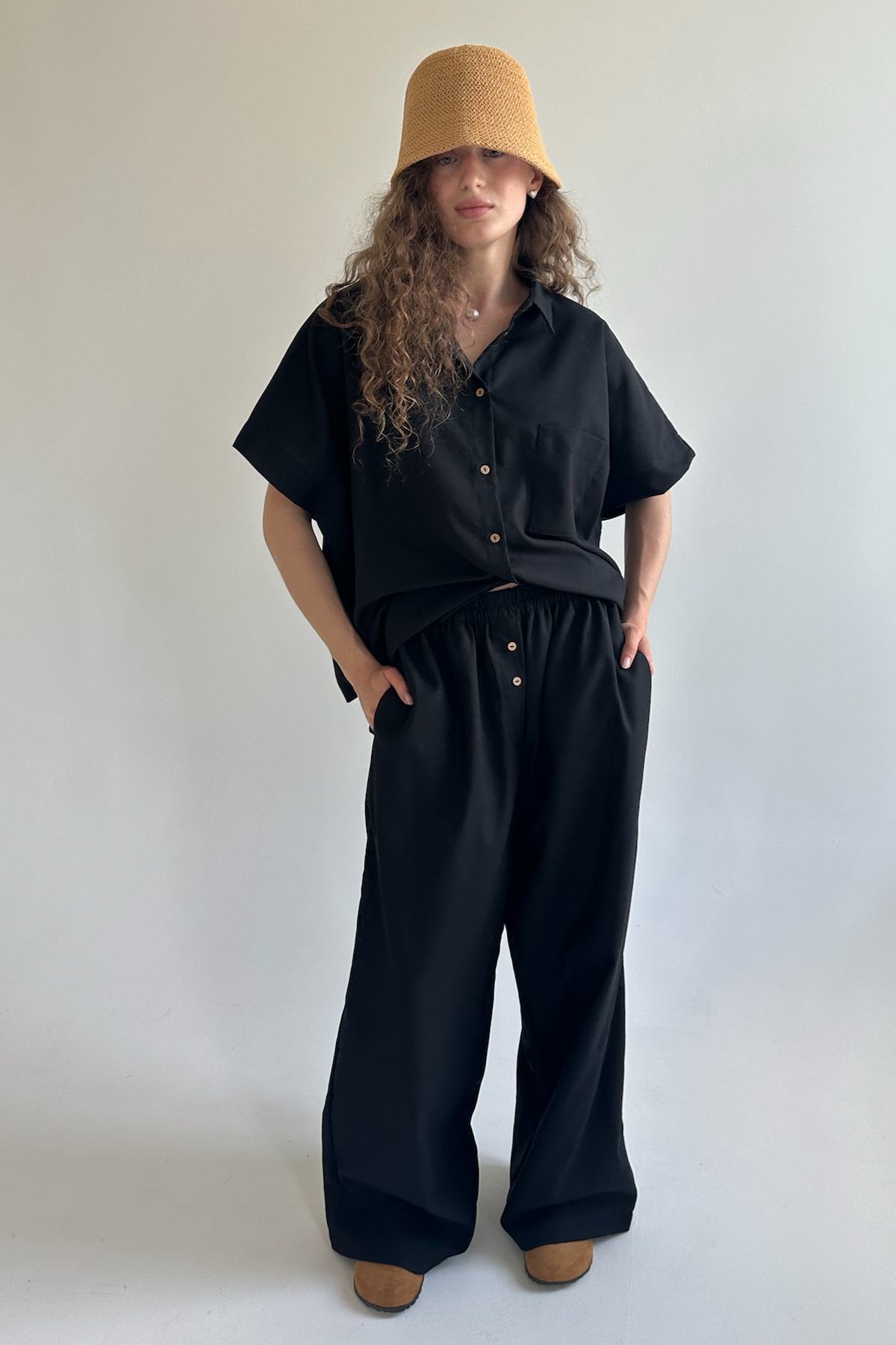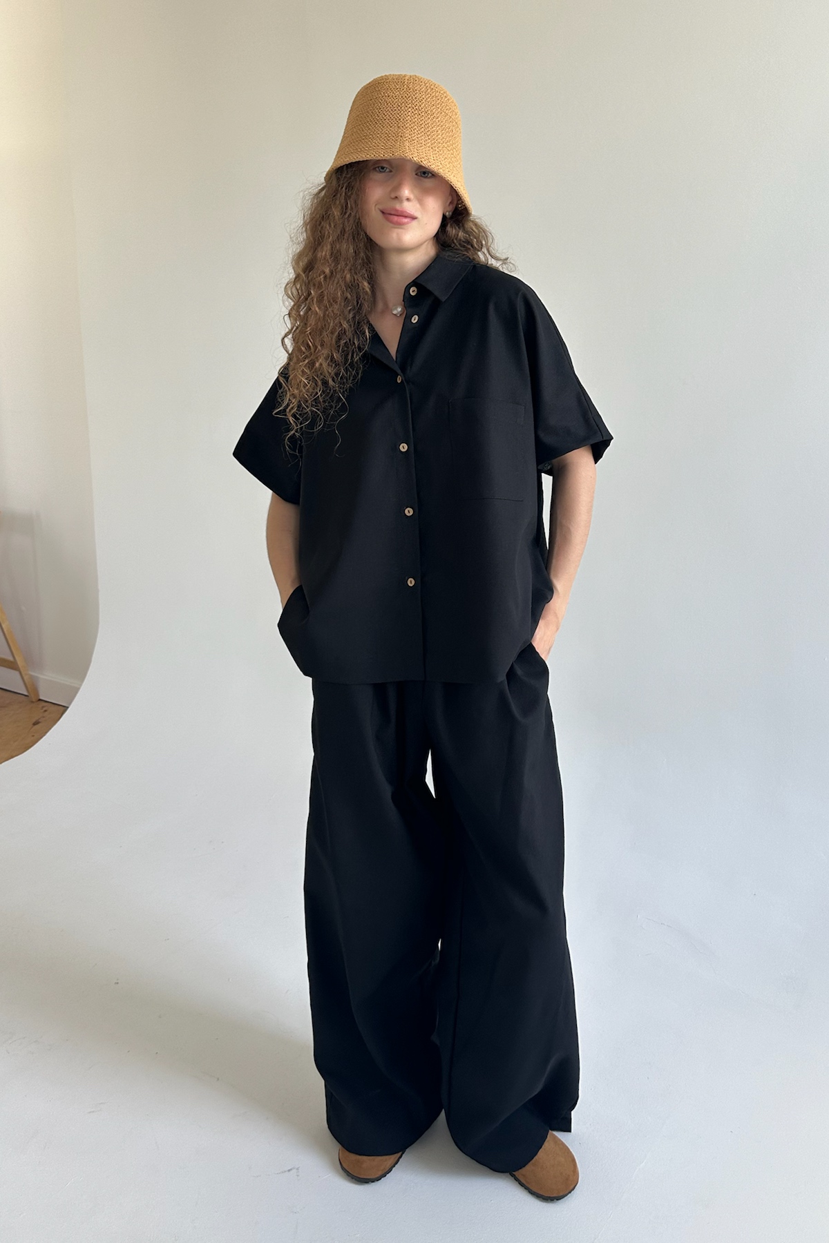 Все изделия имеют безупречный пошив и идеальную посадку. Костюм SET094 рубашка без рукавов с брюкми из хлопка. Свободный крой рубашки и брюк не стесняет ваши движения, брюки с карманами (высокая посадка, на мягкой резинке) не давят и подходят беременным. Костюм идеально садится на любой тип фигуры. Все изделия уникальны и отшиваются небольшими партиями. Стирка изделий вручную либо использовать машинную стирку в деликатном режиме (не более 30 градусов).