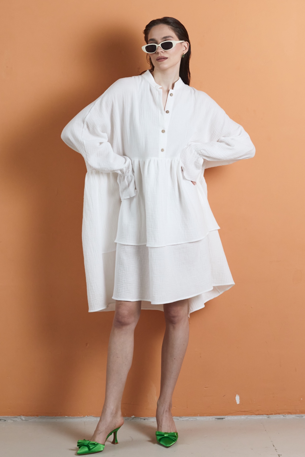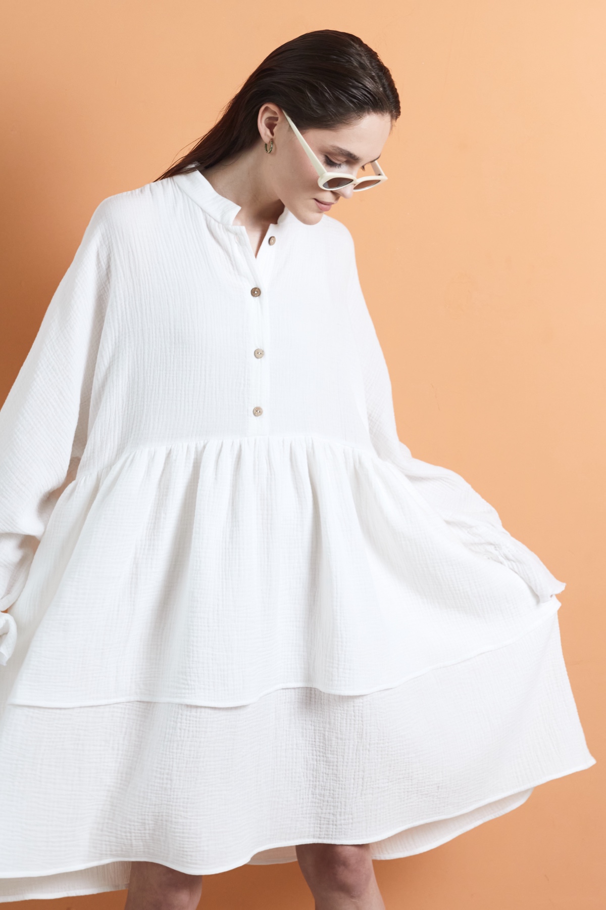 Платье мини из 100% хлопка (муслина) в белоснежном цвете. Рукава - широкий. Завышенная линия талии.