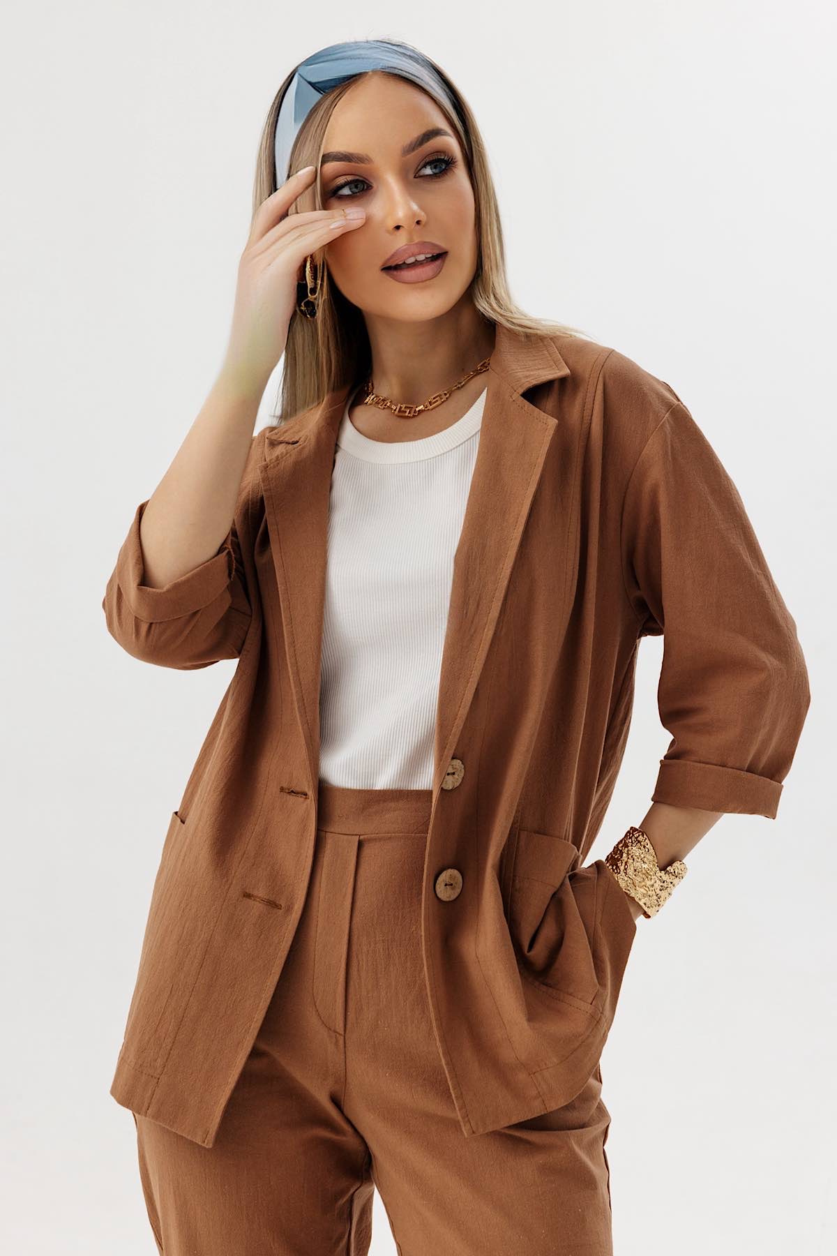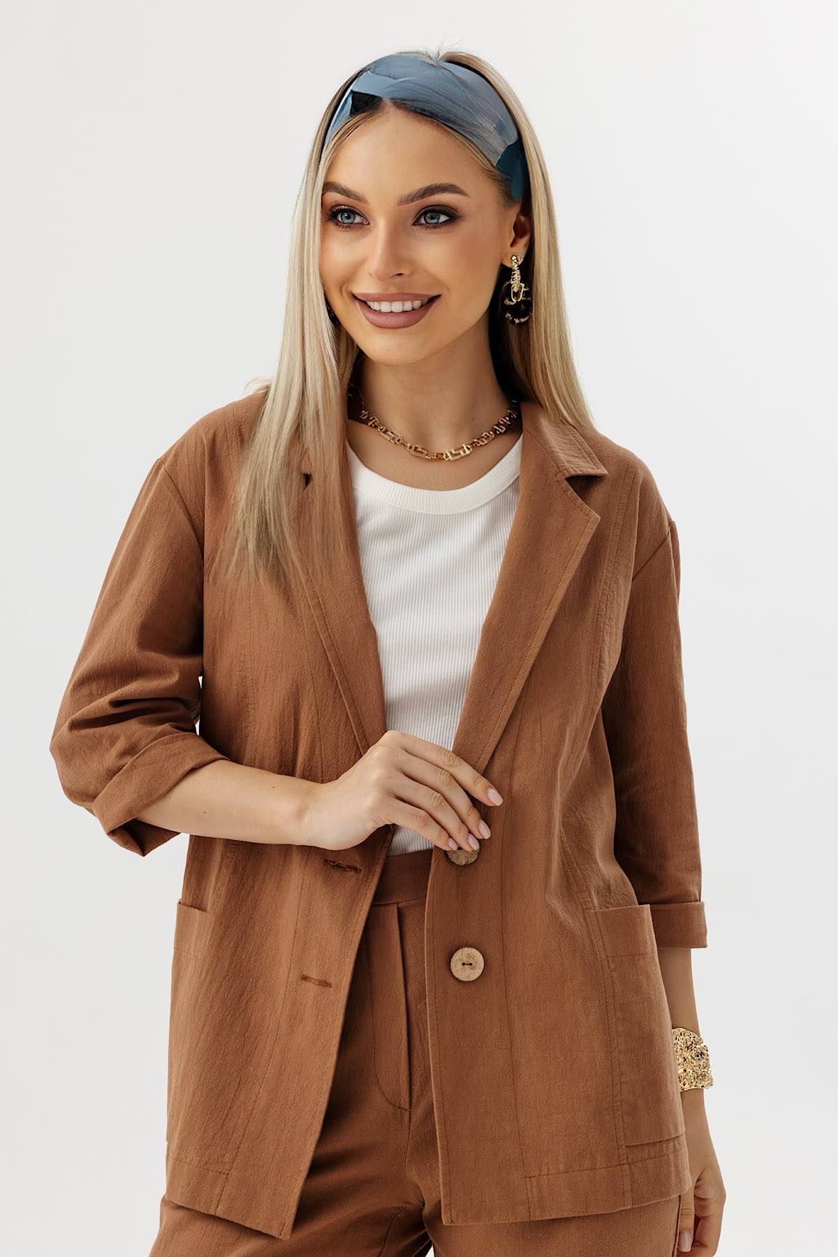 Женский жакет из вареного хлопка с английским воротником. Классический крой и натуральные хлопковые ткани делают этот жакет не только стильным, но и удобным в носке. Женский жакет летний хлопок отлично подойдет для создания как повседневных, так и более элегантных образов. Он подчеркнет вашу индивидуальность и станет незаменимой вещью в гардеробе.. Рукав 3/4.  Дополнена накладными карманами. Функциональные застежки - пуговицы. Идеально подходит для работы и отдыха.