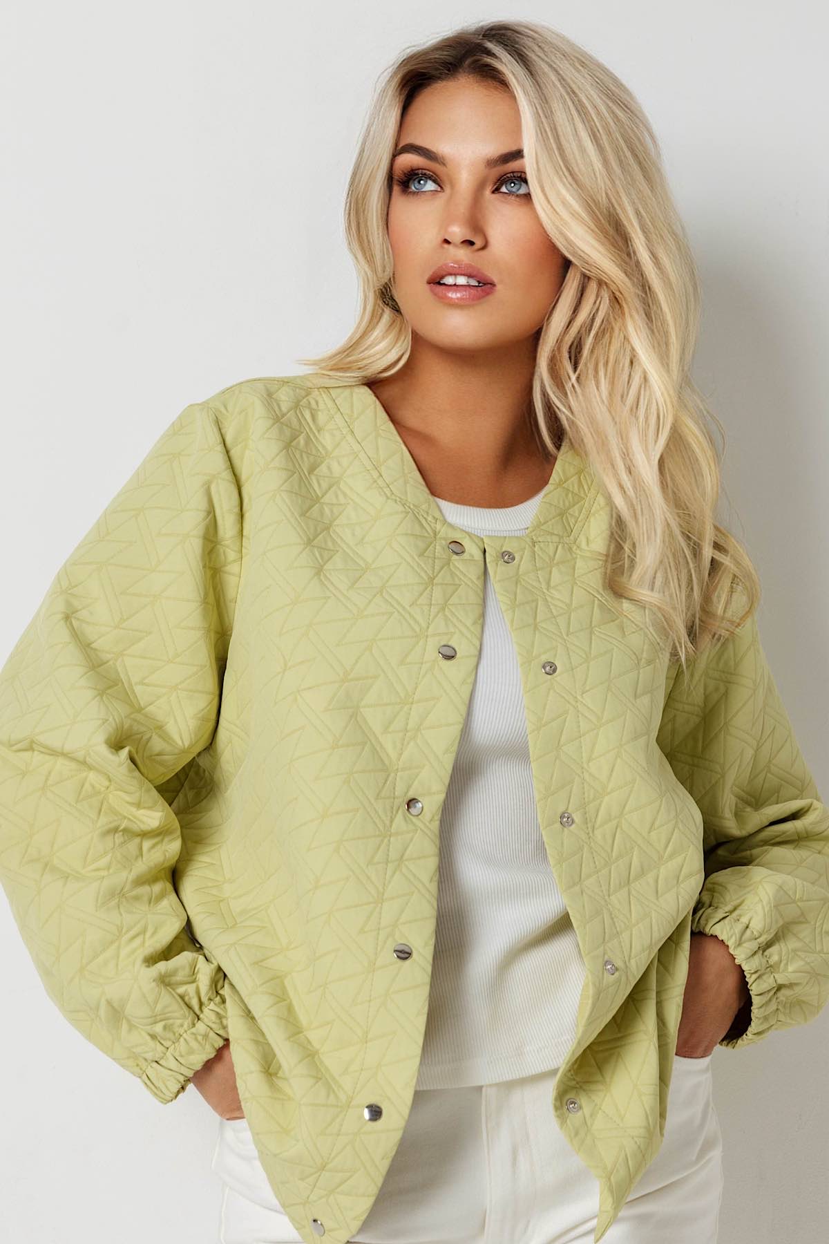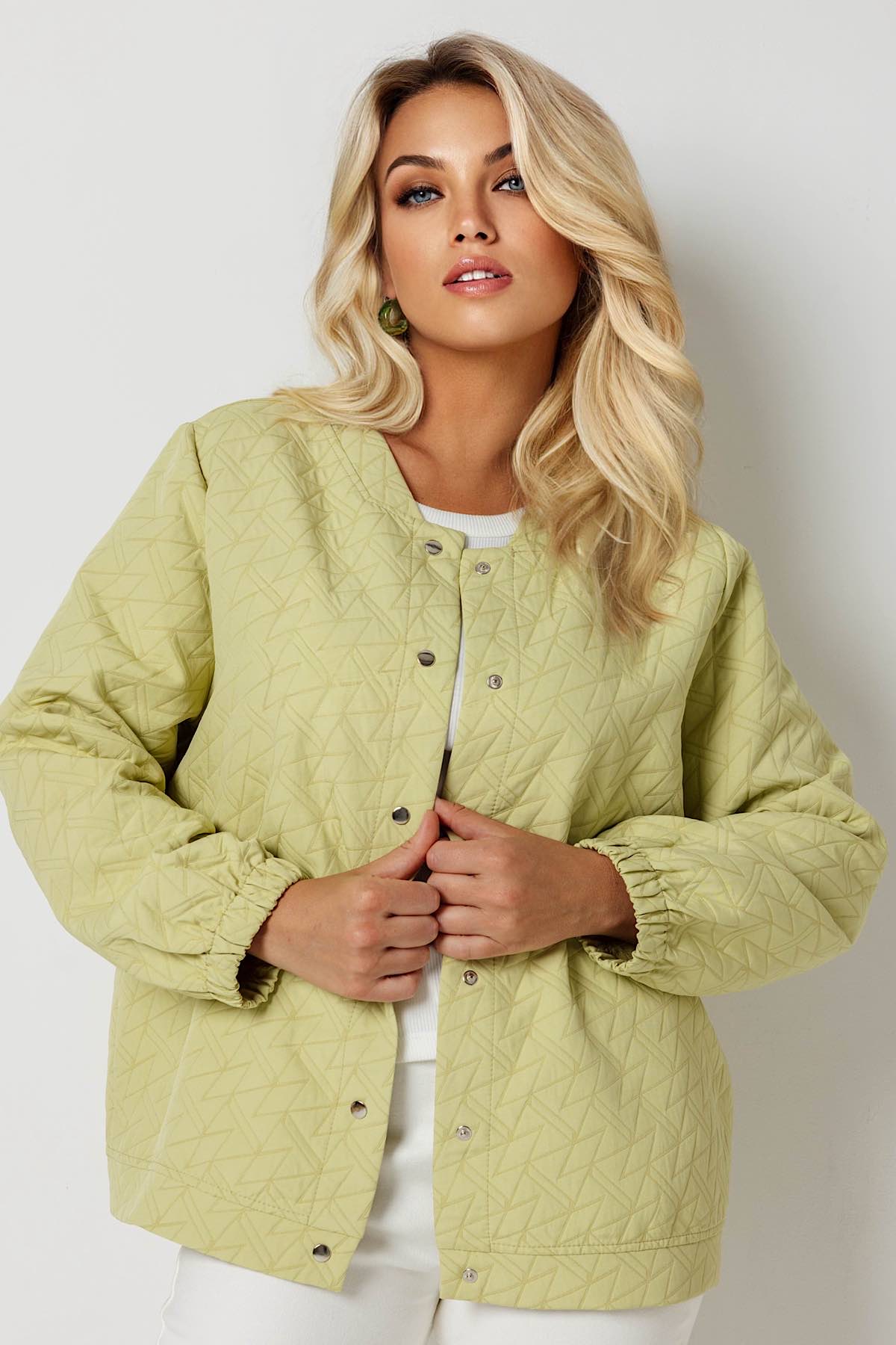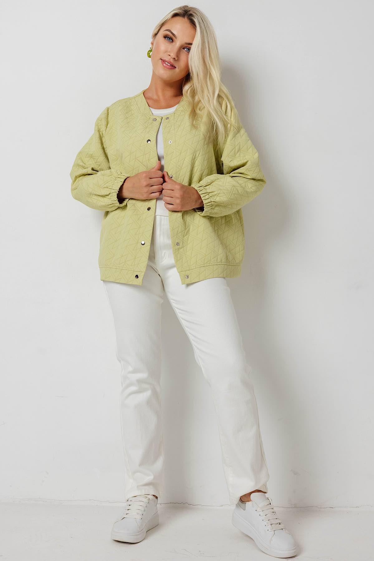 Жакет свободного прямого покроя. Рабочая застежка - кнопки. Жакет изготовлен из стёганого полотна. Длинный рукав со сборкой на резинку. Длина изделия 64 см.