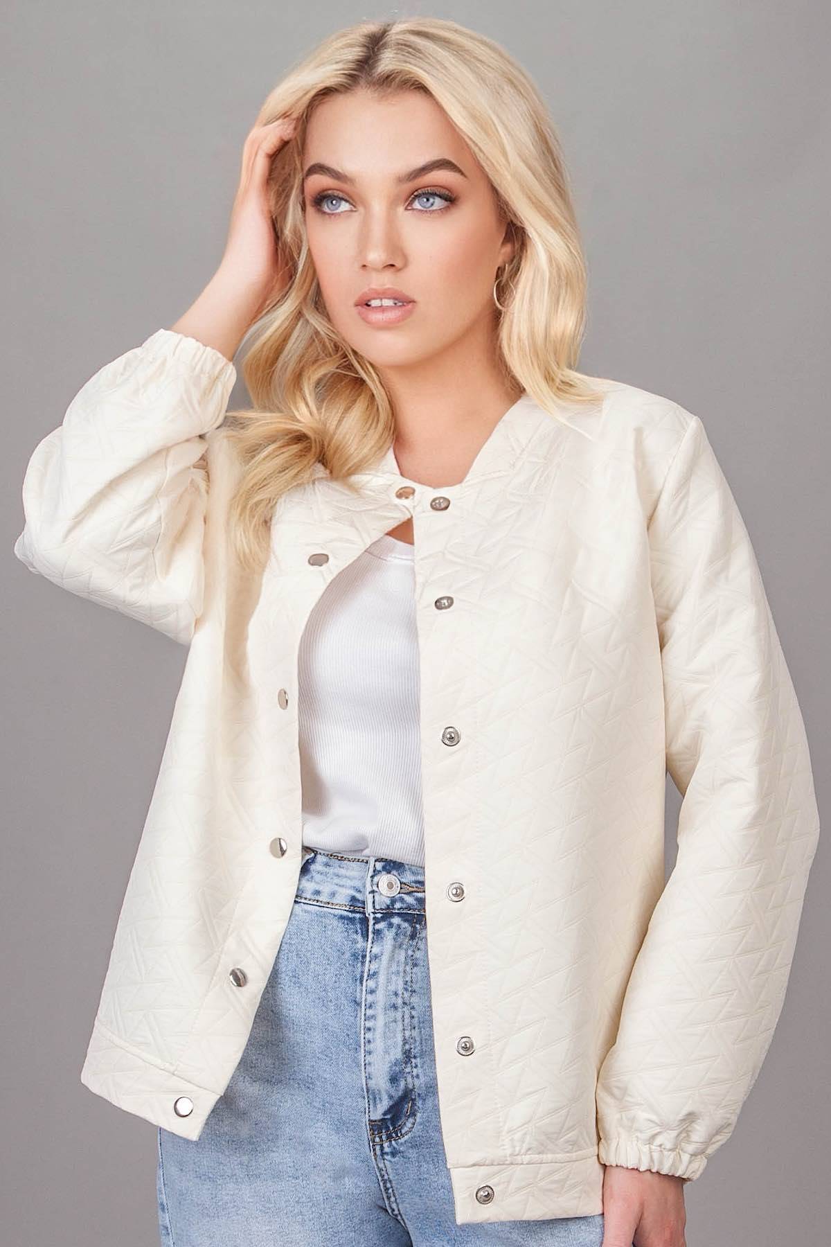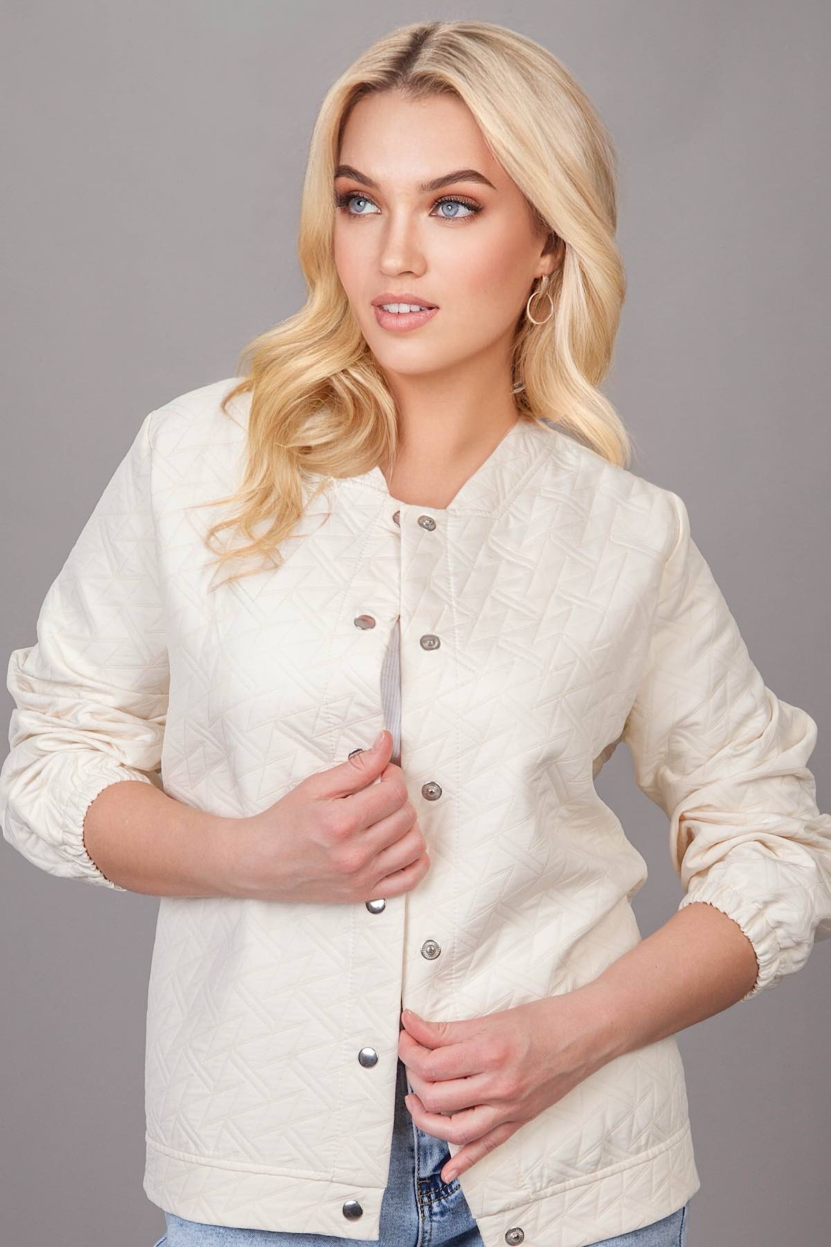 Жакет свободного прямого покроя. Рабочая застежка - кнопки. Жакет изготовлен из стёганого полотна. Длинный рукав со сборкой на резинку. Длина изделия 64 см.