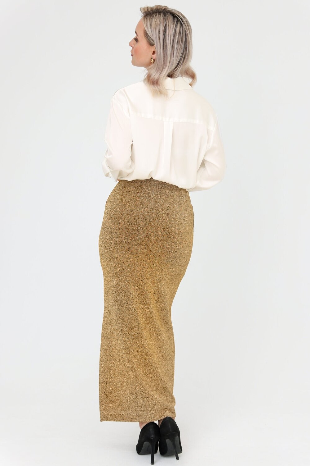 Элегантная однотонная облегающая юбка карандаш с люрексом на резинке. Юбка с высокой талией прекрасно садится на разные фигуры за счет особенности кроя и эластичности ткани. Длина -миди. Длина изделия 95 см.