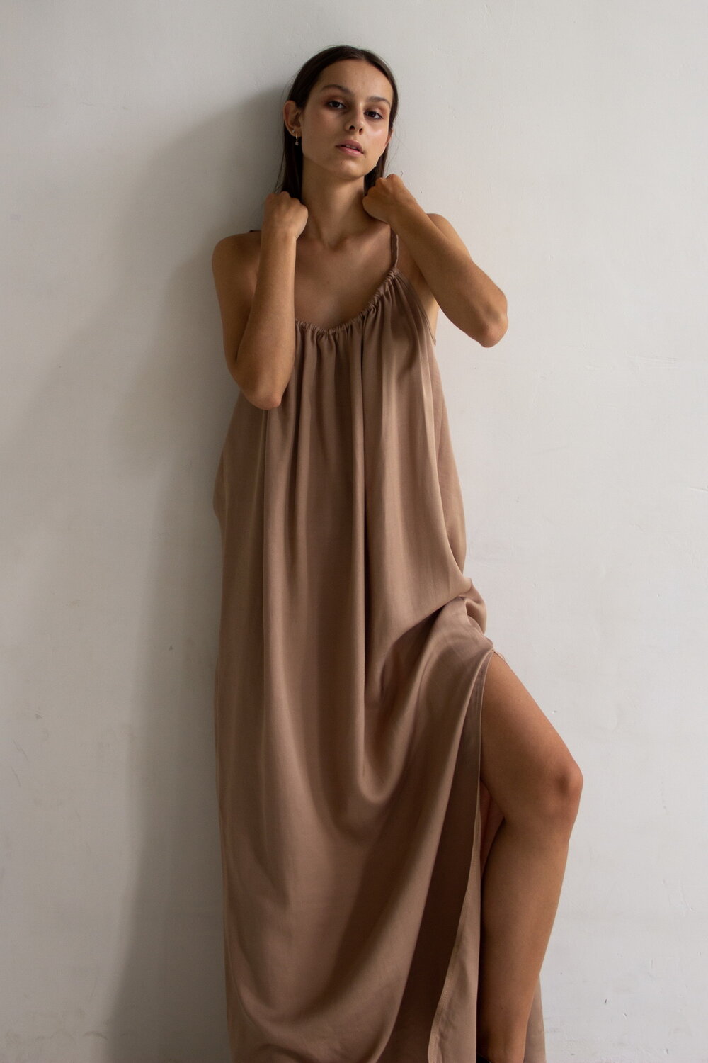 Длиннй сарафан с разрезом из 100% плотной фактурной вискозы. Лямки регулируются.