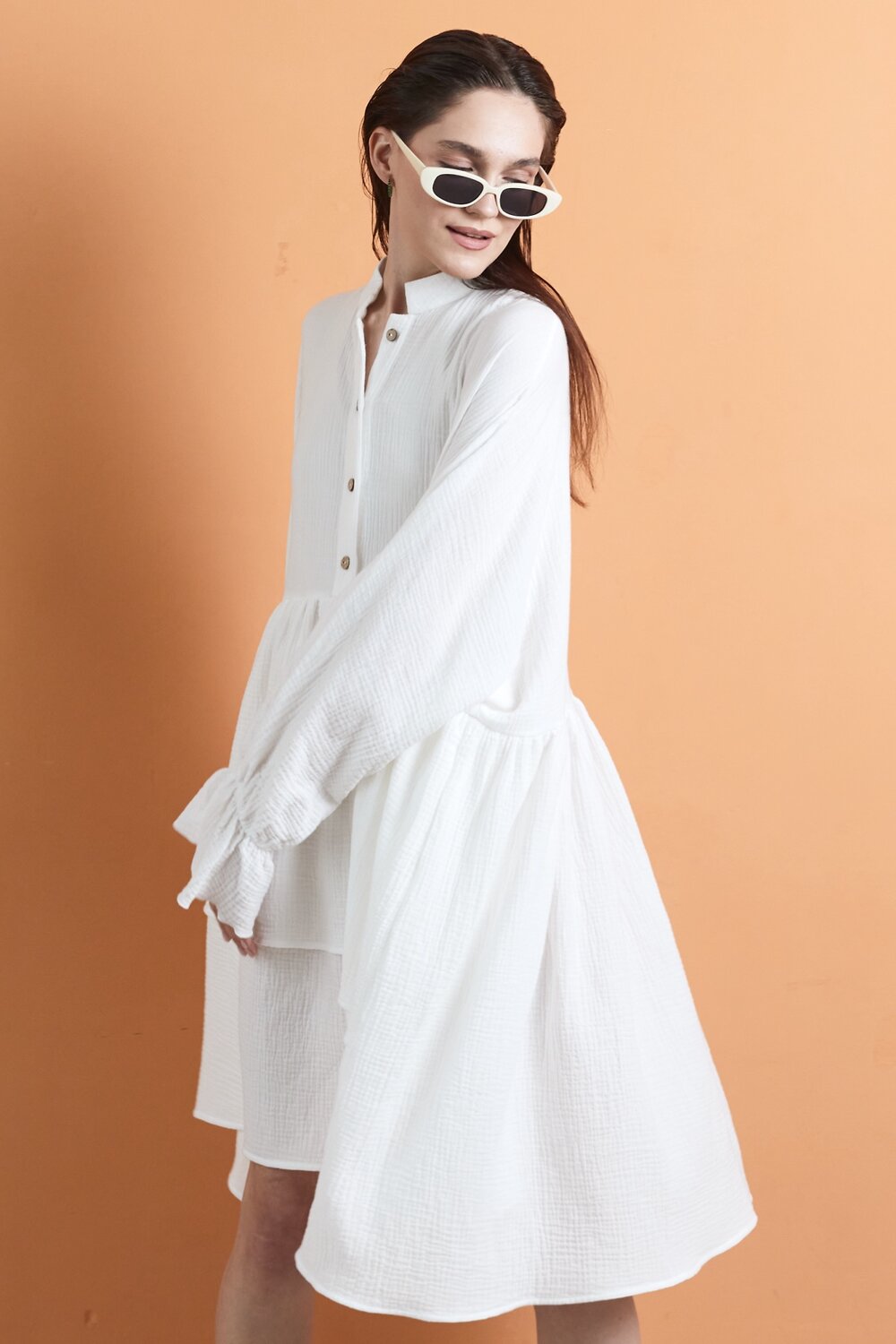 Платье мини из 100% хлопка (муслина) в белоснежном цвете. Рукава - широкий. Завышенная линия талии.