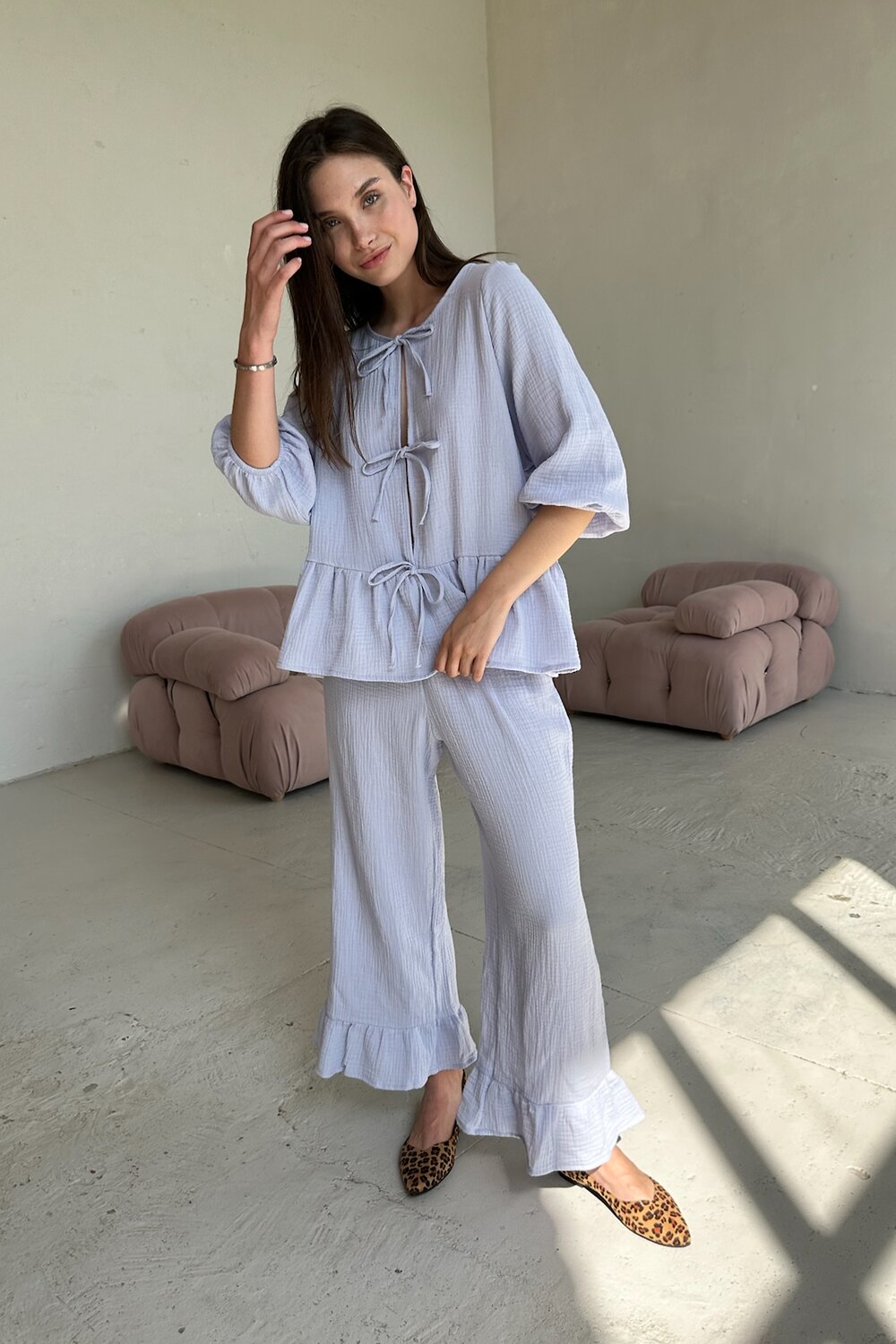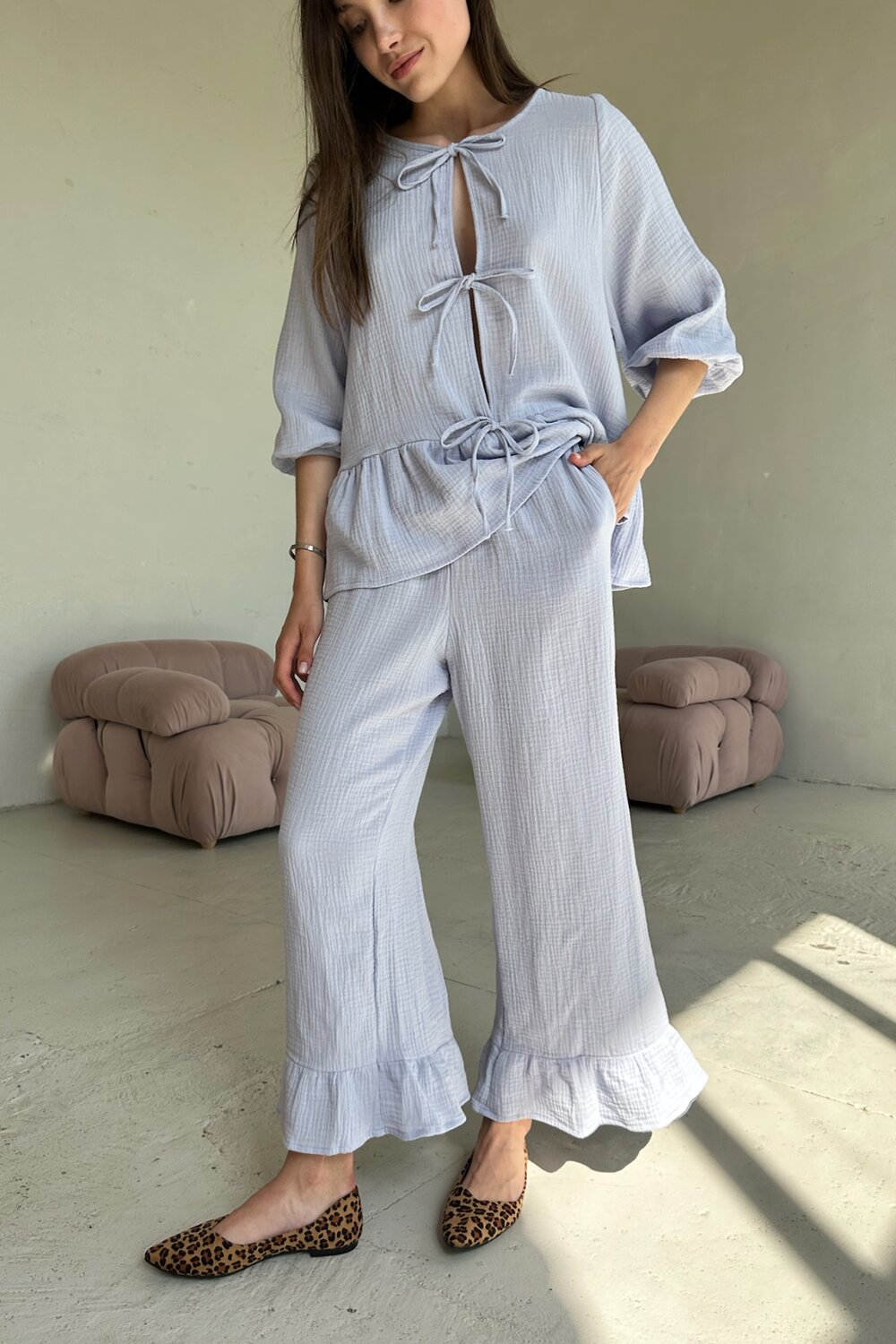 Все изделия имеют безупречный пошив и идеальную посадку. Костюм SET070 блузка с брюками из 100% мягкого хлопка. Свободный крой блузки и брюк не стесняет ваши движения, брюки с карманами (высокая посадка, на мягкой резинке, ручной работы) не давят и подходят беременным. Костюм идеально садится на любой тип фигуры. Все изделия уникальны и отшиваются небольшими партиями. Стирка изделий вручную либо использовать машинную стирку в деликатном режиме (не более 30 градусов).
