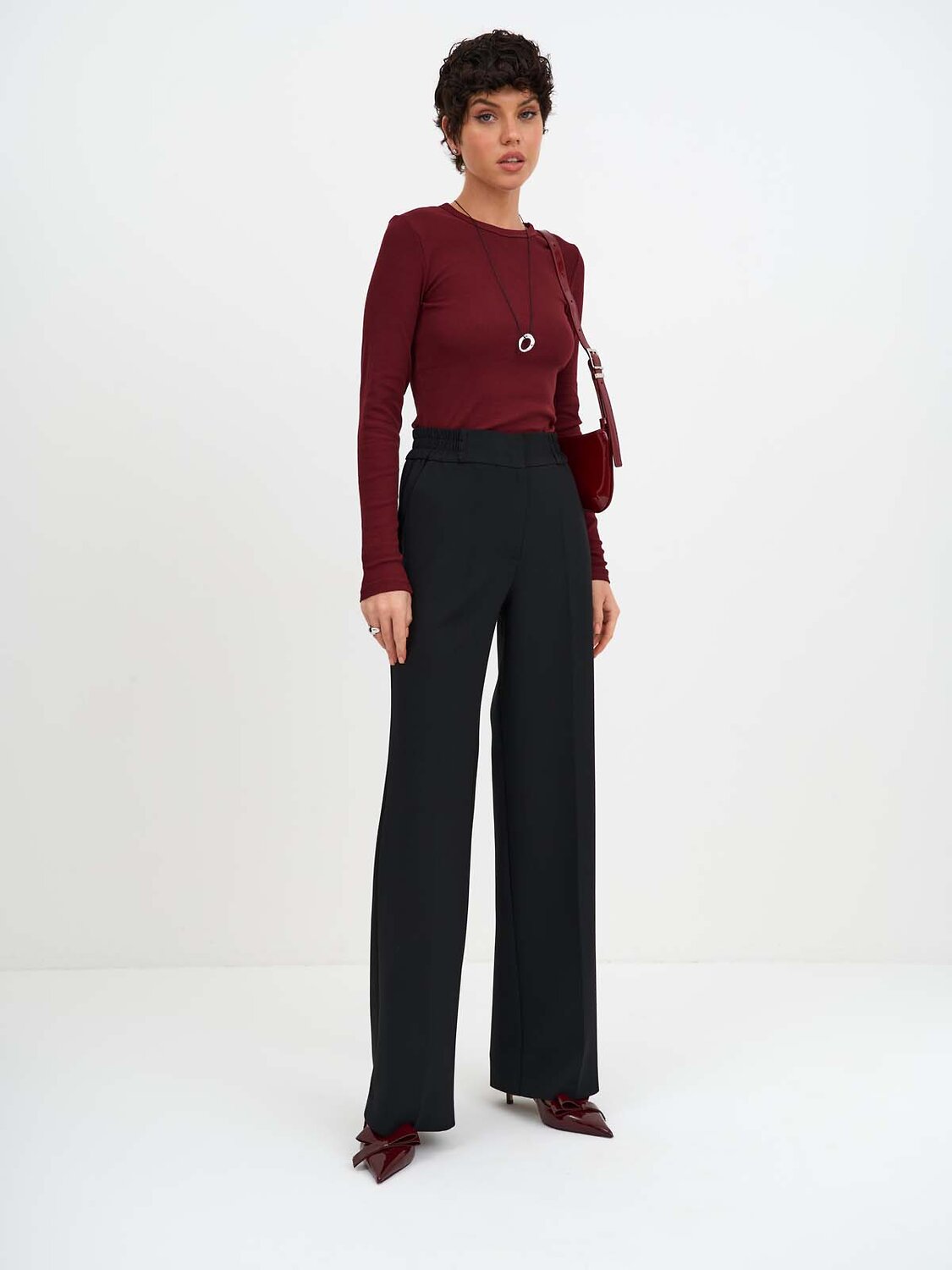 Прямые брюки со стрелками помогут в создании официальных образов. Модель с высокой посадкой сшили из плотной фактурной ткани, которая хорошо держит форму. Притачной пояс надежно фиксируется на талии, или дополнительно стилизуйте его с ремнем.
