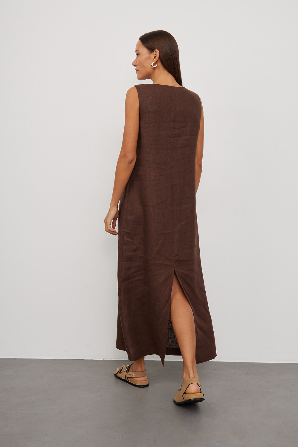 Длинный льняной сарафан на широких бретелях. А-образного силуэта, c разрезами по бокам модель выполнена из 100% льна высокого качества. Сделано в России на собственном производстве. Темно-коричневый