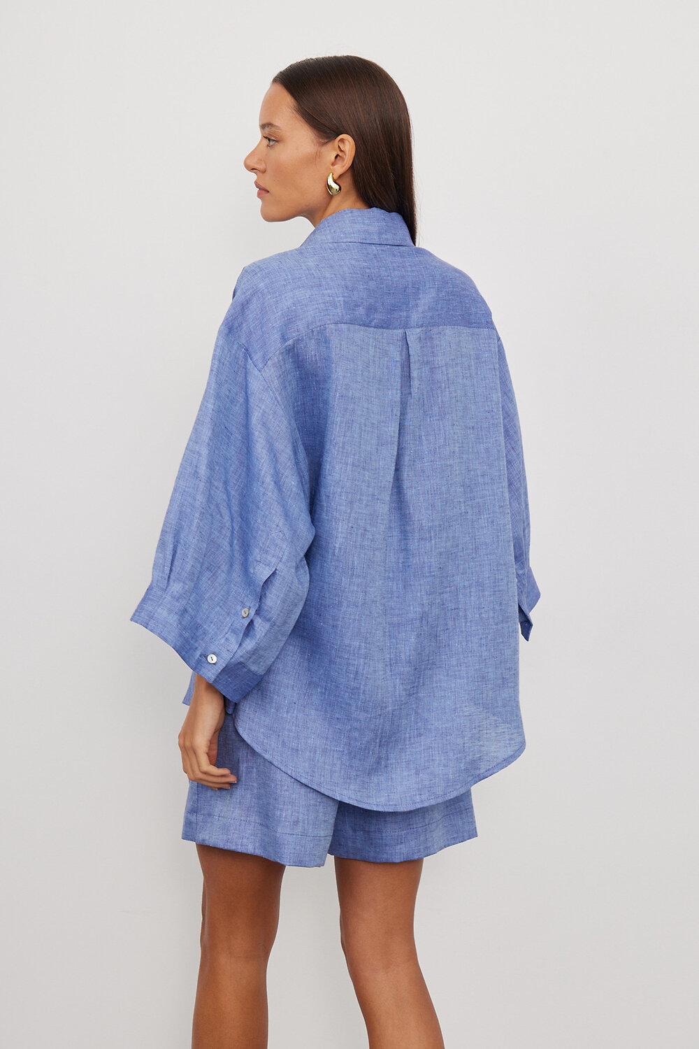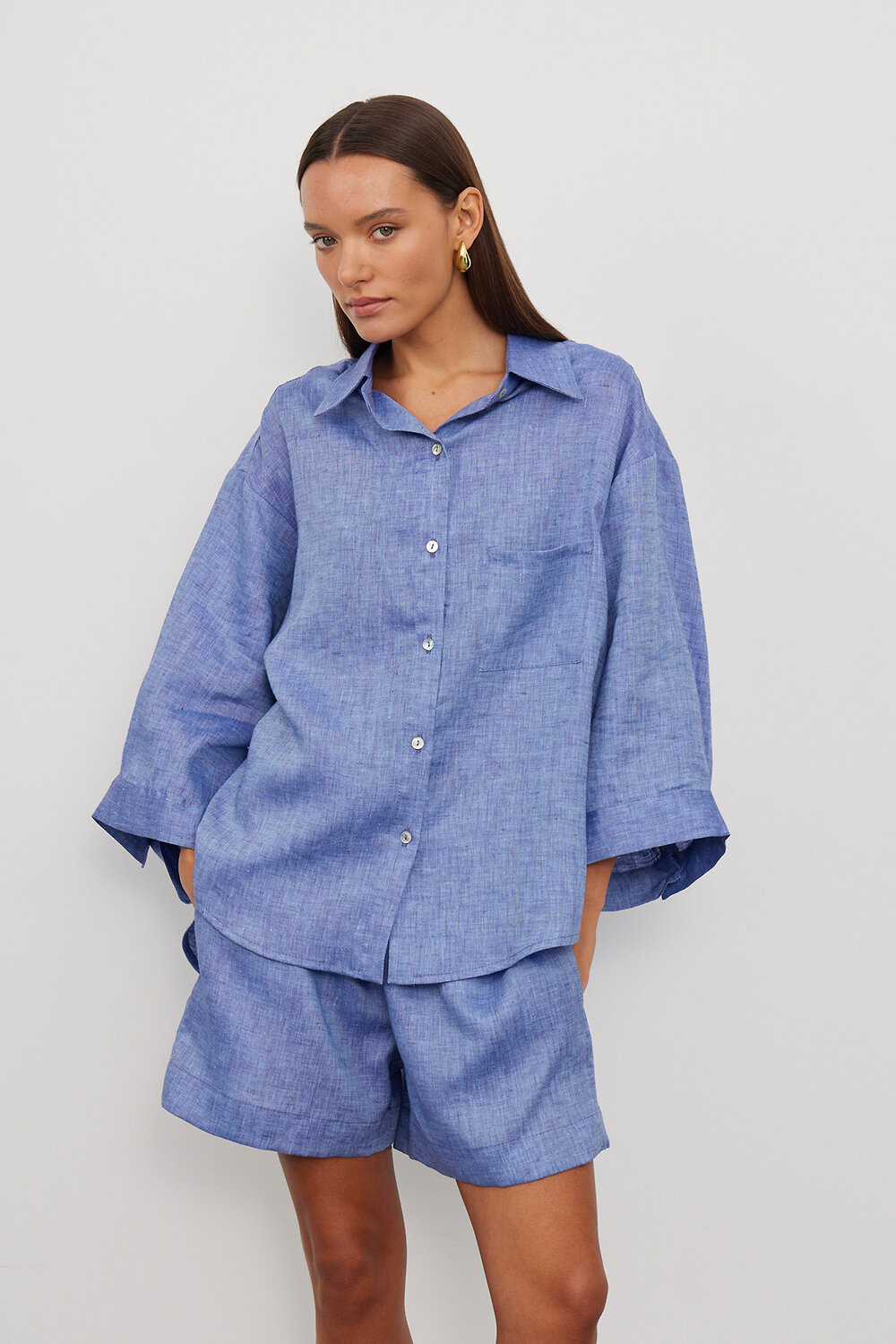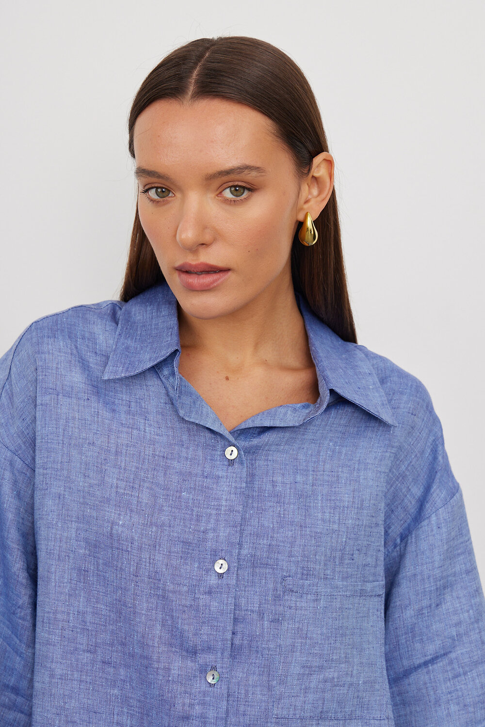 Качественная женская рубашка изо льна свободного кроя, оранжевого цвета, с кокеткой на спине, и разрезами по бокам. Рубашка подходит как для офиса, так и для повседневных образов. Тонкий длинноволокнистый лен особенно прочный, отлично пропускает воздух и впитывает влагу, что делает его идеальным выбором для гардероба. Свободная и удлиненная, эта легкая рубашка может дополнить образы для отдыха с шортами и короткими топами, легинсами, джинсами, брюками и юбками. Рубашку можно носить как блузку, а можно носить как второй слой поверх футболки или топа. Сделано в России на собственном производстве. Голубой меланж