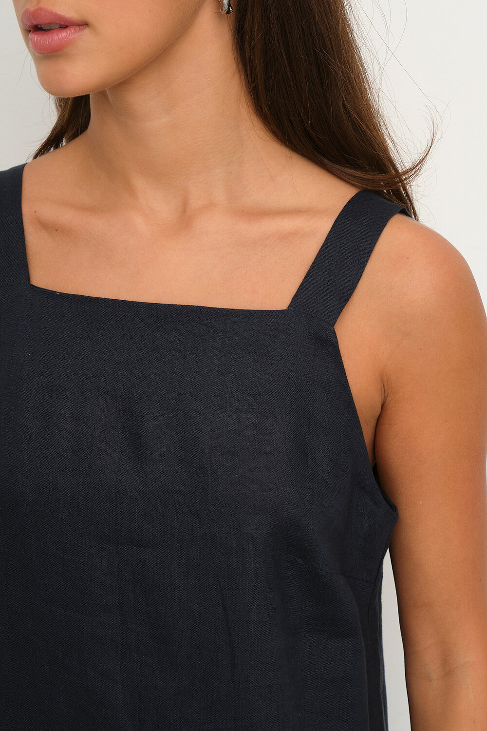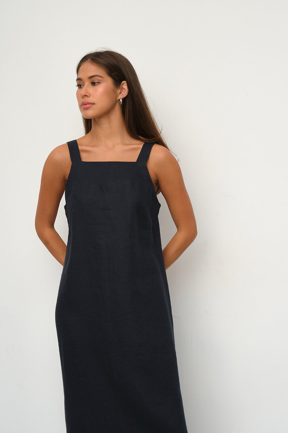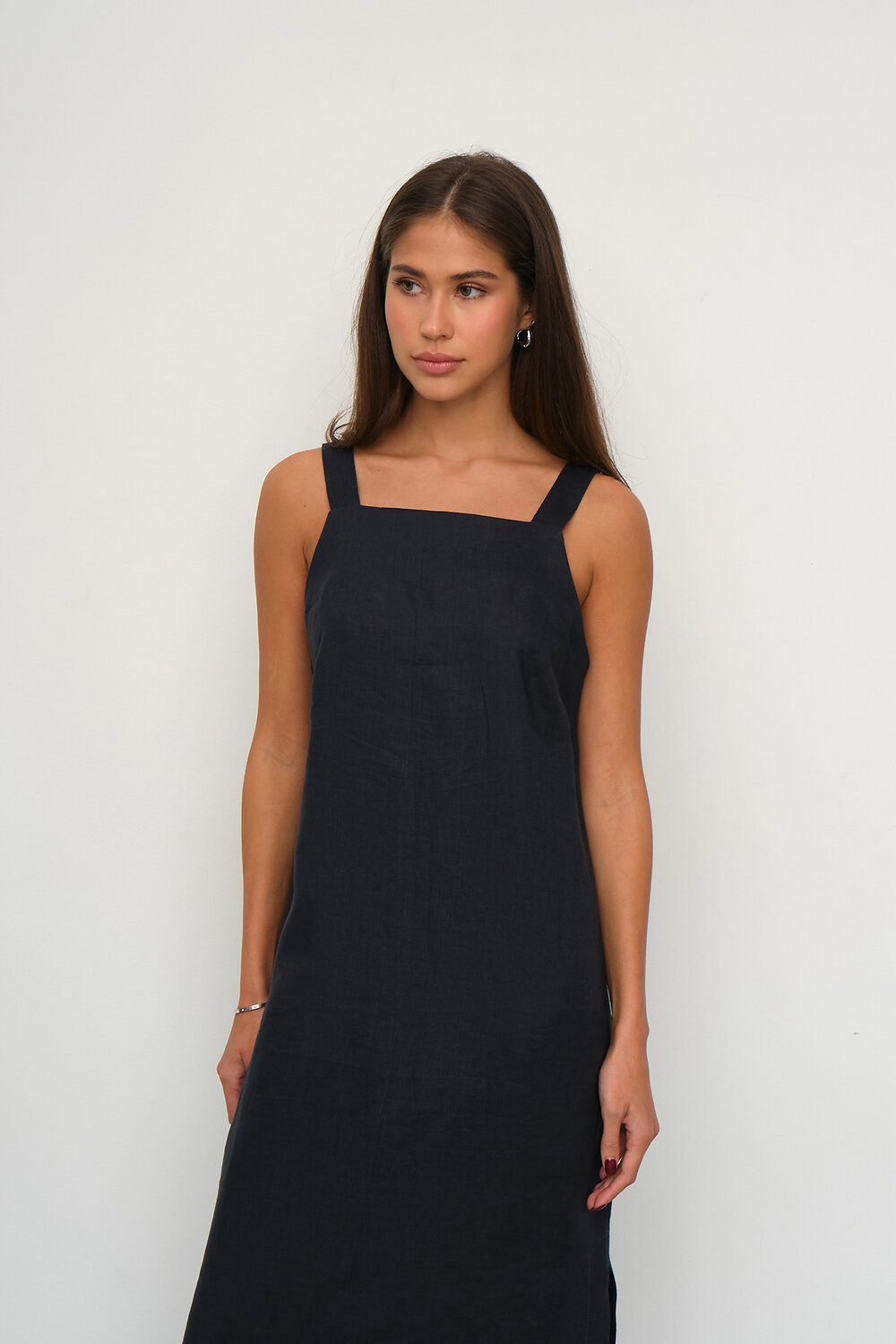 Длинный льняной сарафан на широких бретелях брусничного цвета. Платье А-образного силуэта, c разрезами по бокам модель выполнена из 100% льна высокого качества. Сделано в России на собственном производстве. Темно-синий