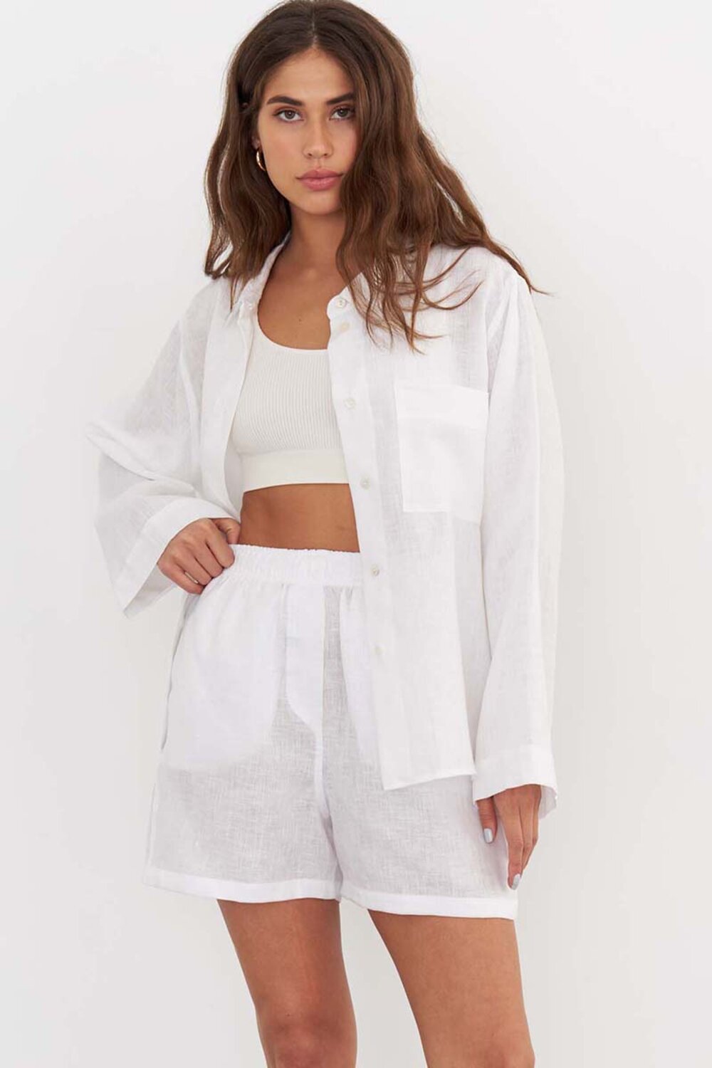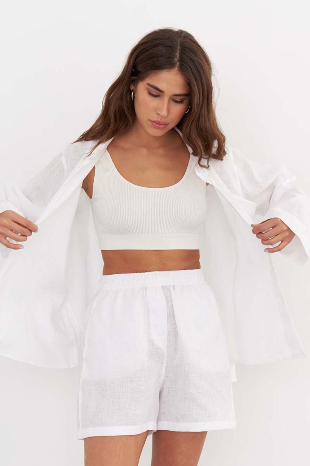 Укороченная рубашка из натурального льна, белого цвета. Короткая рубашка оверсайз является трендм сезона и стильно дополнит образы для отдыха с шортами и короткими топами, легинсами, джинсами, брюками и юбками. Рубашку можно носить как блузку, а можно носить как второй слой поверх футболки или топа. Сделано в России на собственном производстве. Белый