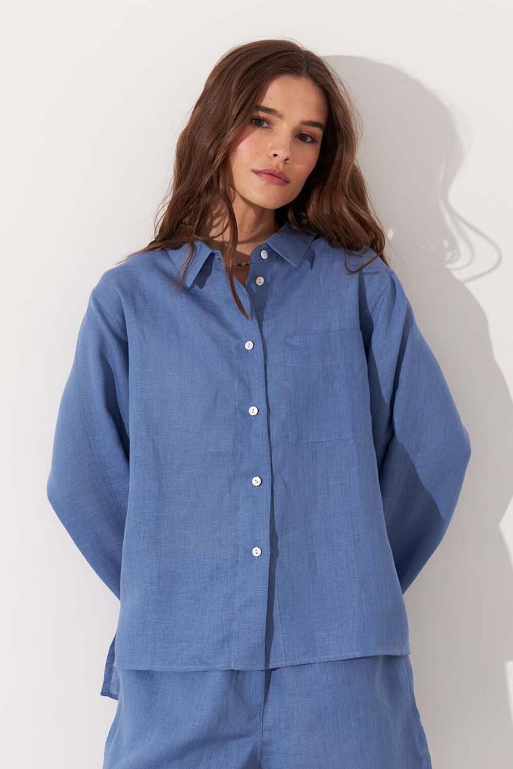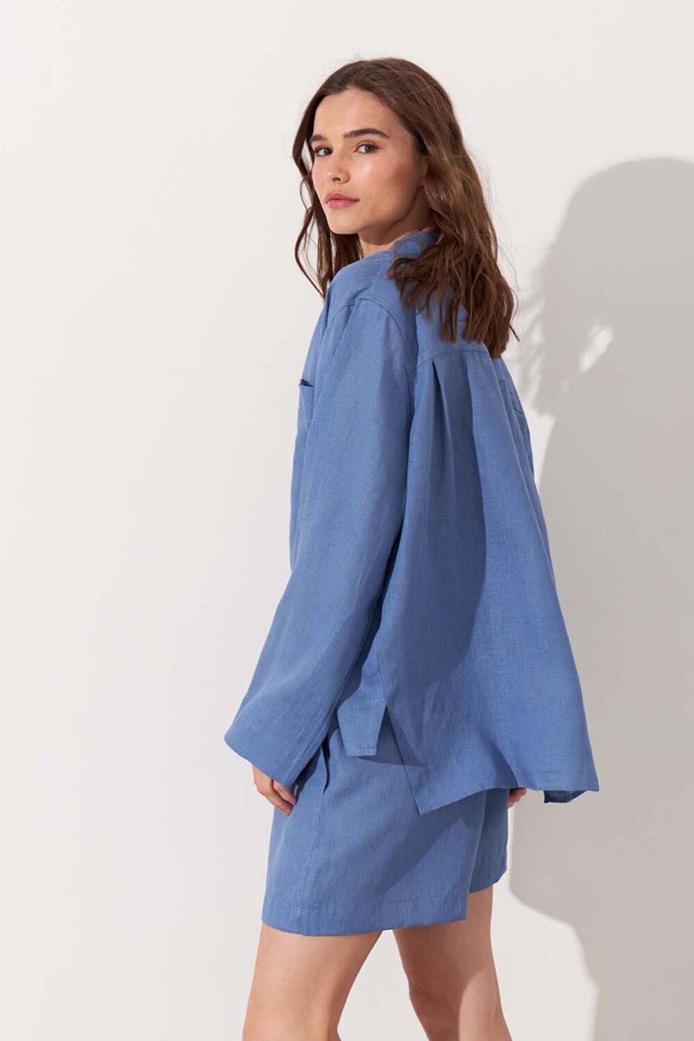 Укороченная рубашка из натурального льна, голубого цвета. Короткая рубашка оверсайз является трендм сезона и стильно дополнит образы для отдыха с шортами и короткими топами, легинсами, джинсами, брюками и юбками. Рубашку можно носить как блузку, а можно носить как второй слой поверх футболки или топа. Сделано в России на собственном производстве. Голубой
