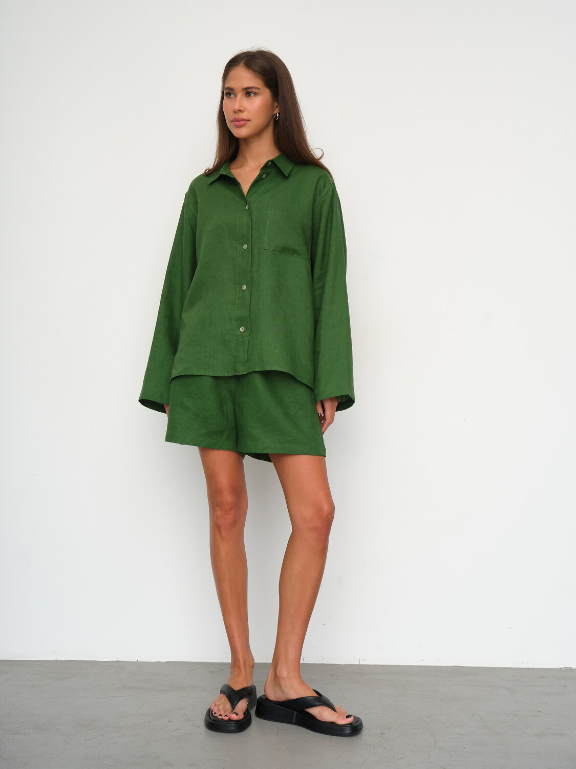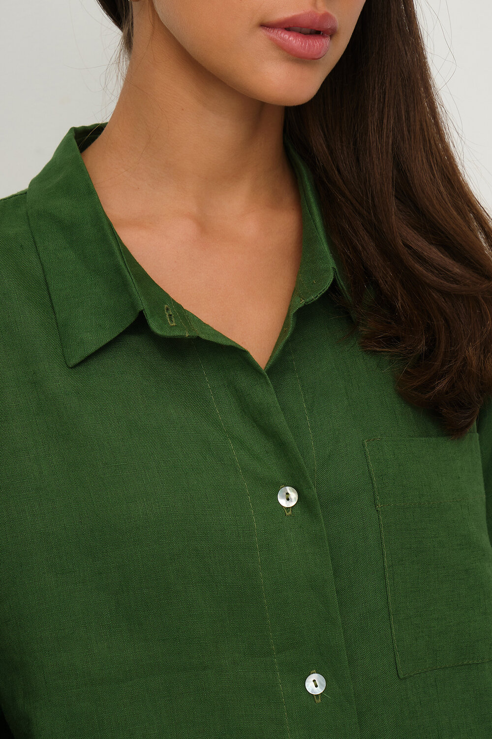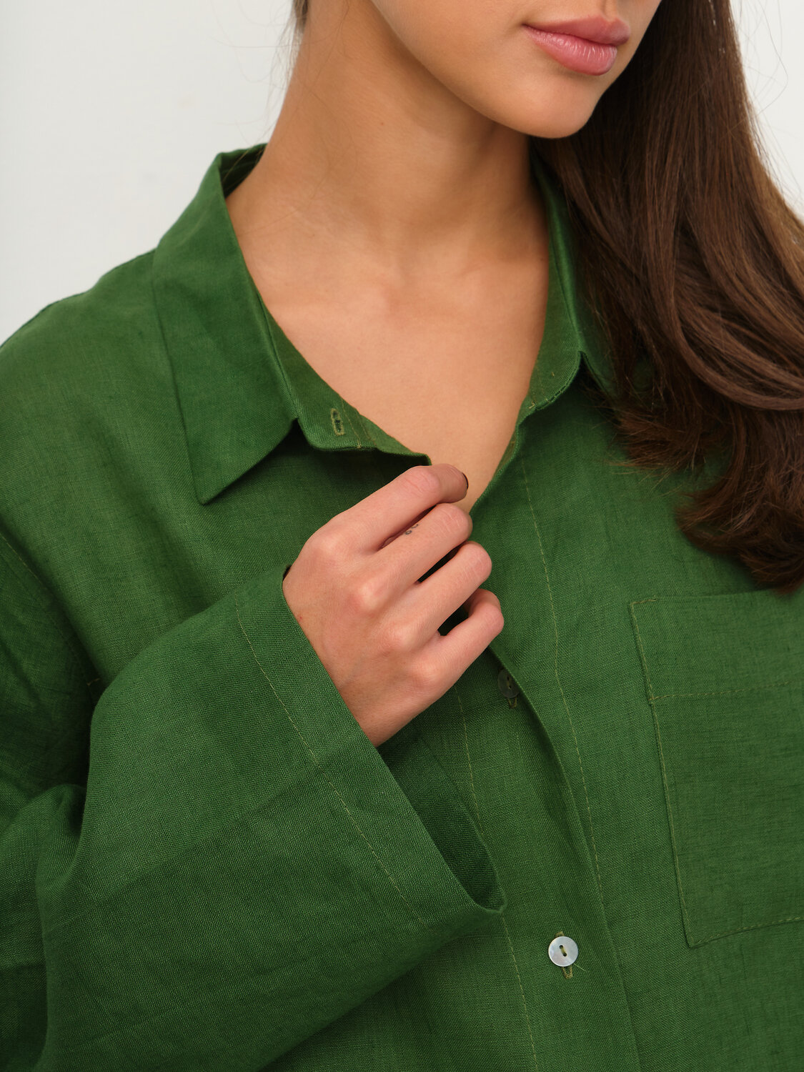 Качественная женская рубашка изо льна свободного кроя, оранжевого цвета, с кокеткой на спине, и разрезами по бокам. Рубашка подходит как для офиса, так и для повседневных образов. Тонкий длинноволокнистый лен особенно прочный, отлично пропускает воздух и впитывает влагу, что делает его идеальным выбором для гардероба. Свободная и удлиненная, эта легкая рубашка может дополнить образы для отдыха с шортами и короткими топами, легинсами, джинсами, брюками и юбками. Рубашку можно носить как блузку, а можно носить как второй слой поверх футболки или топа. Сделано в России на собственном производстве. Травяной