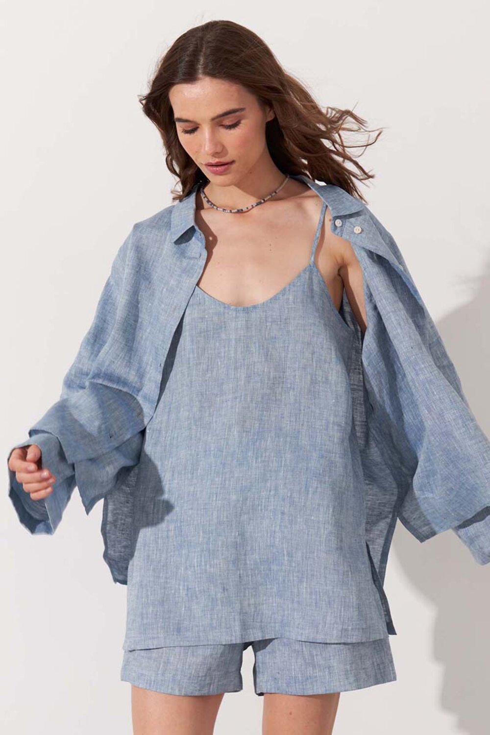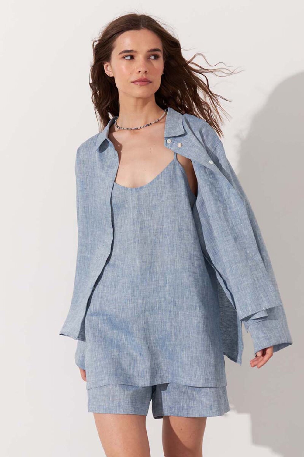 Укороченная рубашка из натурального льна, цвета светло-голубой меланж. Короткая рубашка оверсайз является трендм сезона и стильно дополнит образы для отдыха с шортами и короткими топами, легинсами, джинсами, брюками и юбками. Рубашку можно носить как блузку, а можно носить как второй слой поверх футболки или топа. Сделано в России на собственном производстве. Светло-голубой меланж
