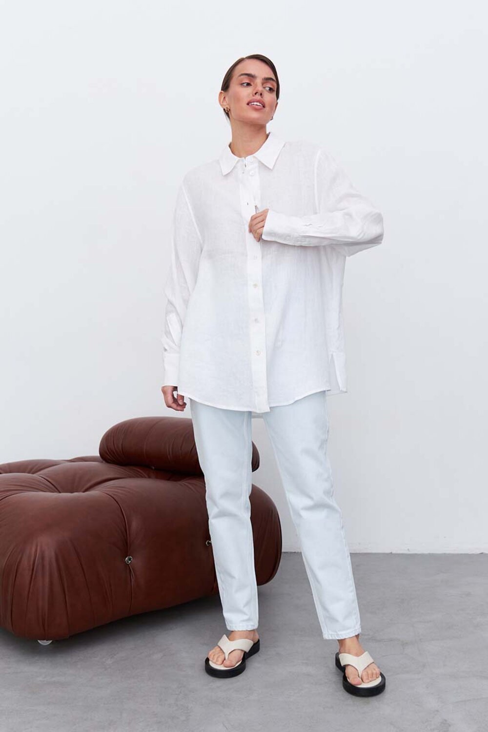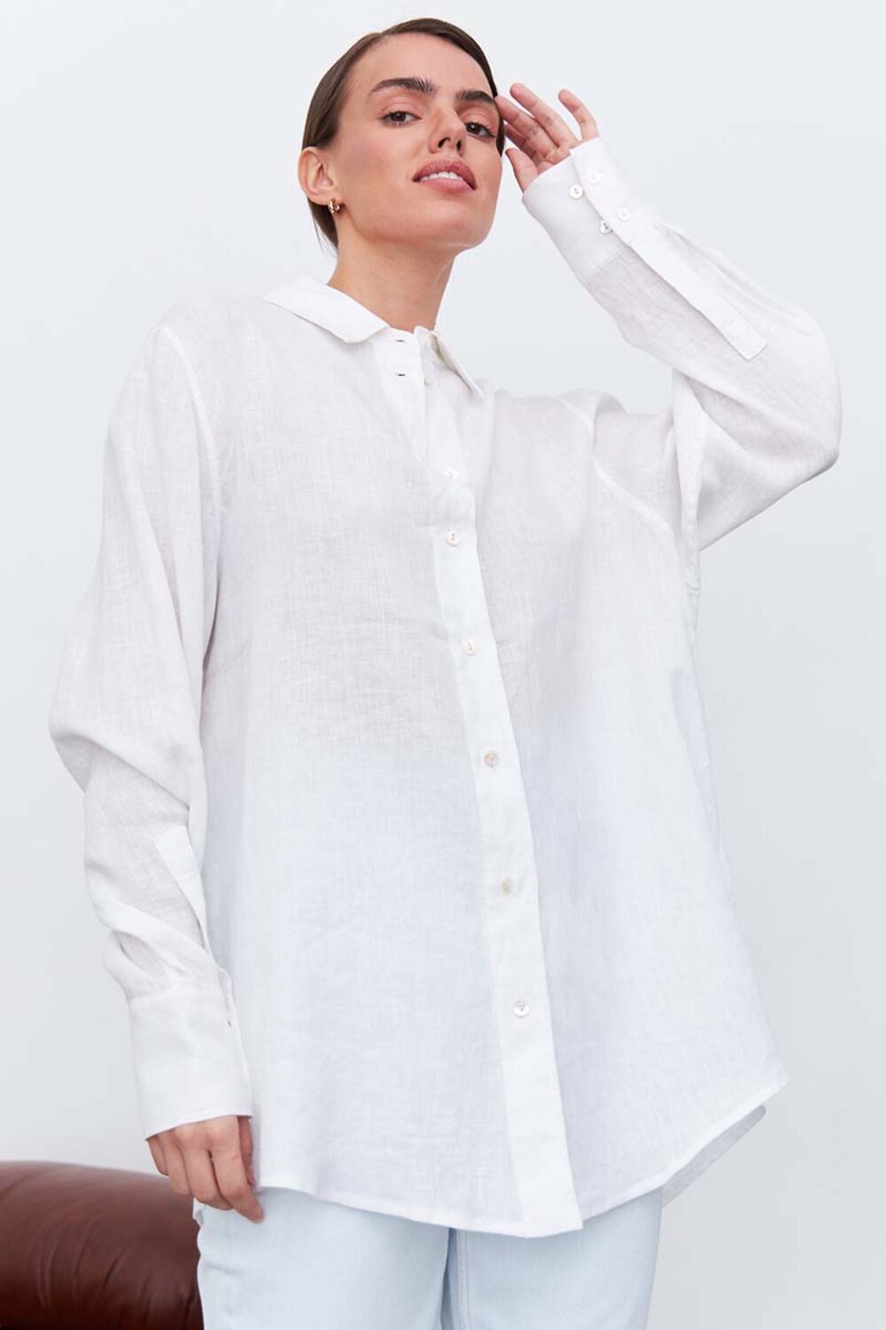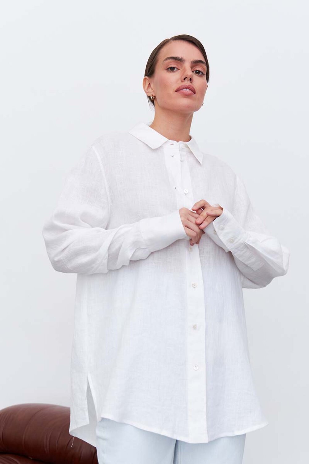 Качественная женская рубашка изо льна свободного кроя, чисто белого цвета, с кокеткой на спине, и разрезами по бокам. Рубашка подходит как для офиса, так и для повседневных образов. Тонкий длинноволокнистый лен особенно прочный, отлично пропускает воздух и впитывает влагу, что делает его идеальным выбором для гардероба. Свободная и удлиненная, эта легкая рубашка может дополнить образы для отдыха с шортами и короткими топами, легинсами, джинсами, брюками и юбками. Рубашку можно носить как блузку, а можно носить как второй слой поверх футболки или топа. Сделано в России на собственном производстве. Белый