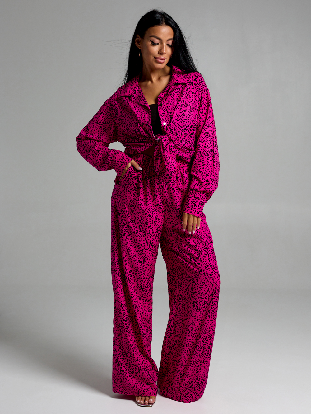 Костюм женский состоит из рубашки и брюк. Рубашка –  прямого силуэта. Брюки прямые от бедра с отрезным поясом.