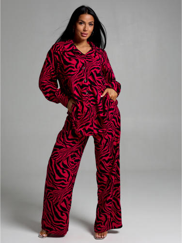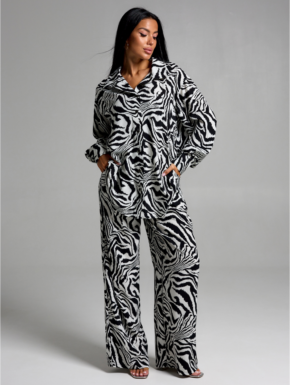 Костюм женский состоит из рубашки и брюк. Рубашка –  прямого силуэта. Брюки прямые от бедра с отрезным поясом.
