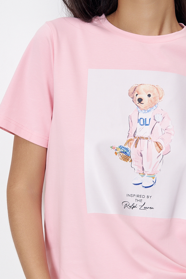 Джемпер из хлопкового эластичного полотна свободного силуэта. Втачной короткий рукав. Круглый вырез горловины оформлен бейкой. На передней части изделия нанесён принт методом шелкографии.