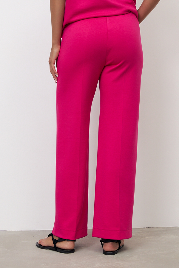 Брюки прямого силуэта из эластичного полотна. Пояс притачной с эластичной резиной. На передней части брюк застрочены стрелки.