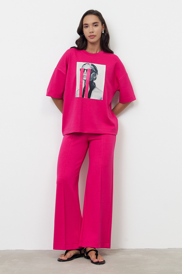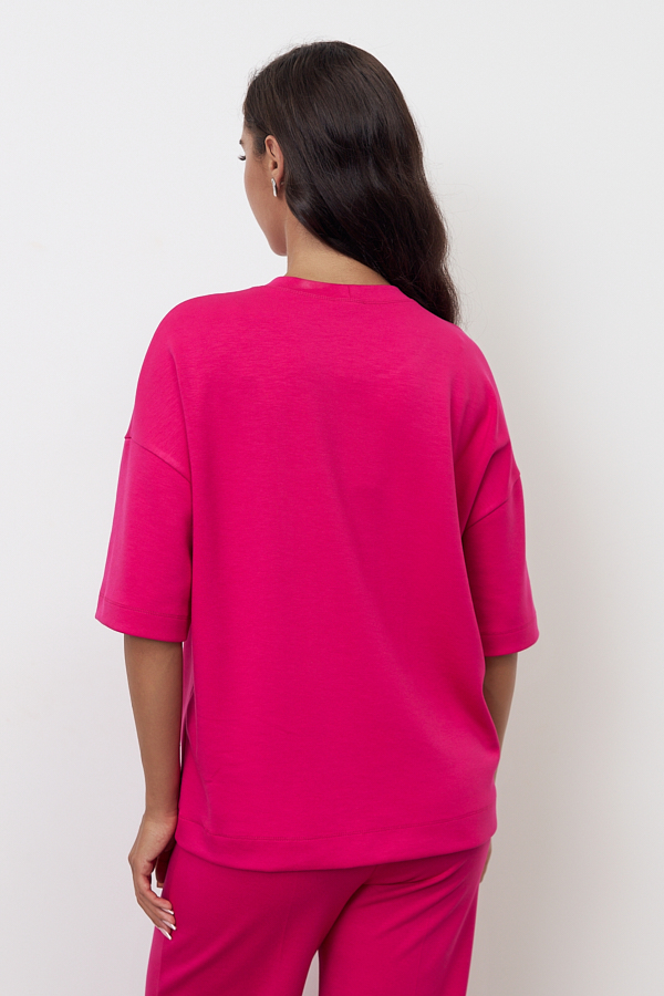 Джемпер свободного силуэта со спущенной линией плеча и рукавом до локтя выполнен из эластичного полотна. Вырез горловины оформлен бейкой из основной ткани. На передней части изделия выполнена аппликация. В таблице размеров представлены параметры человека, а не изделия.