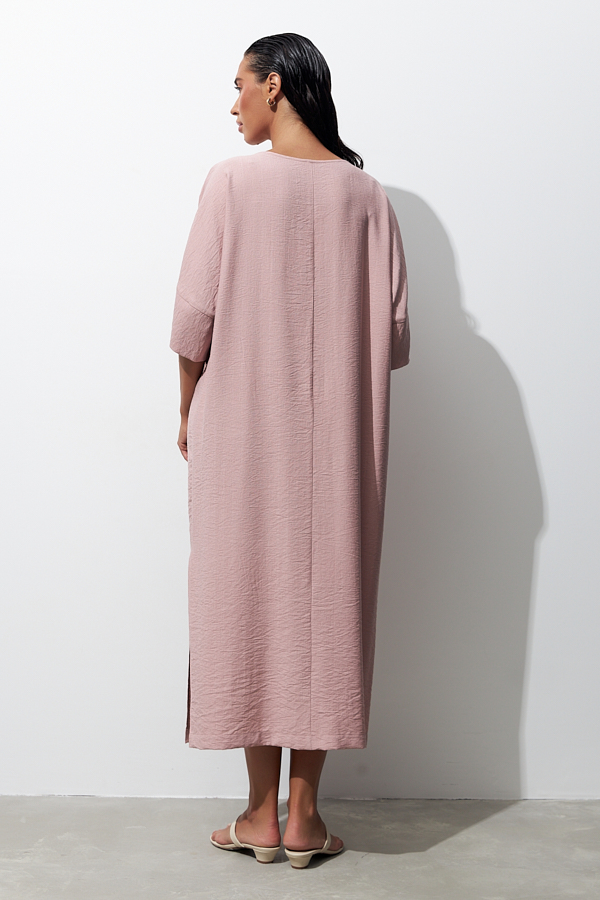 Платье из вискозной ткани с крэш-эффектом. Свободный силуэт, с разрезом в боковом шве. Круглый вырез горловины окантован косой бейкой из основной ткани. Цельнокроеный рукав с притачной манжетой. В комплекте пояс из основной ткани. В таблице размеров представлены параметры человека, а не изделия.