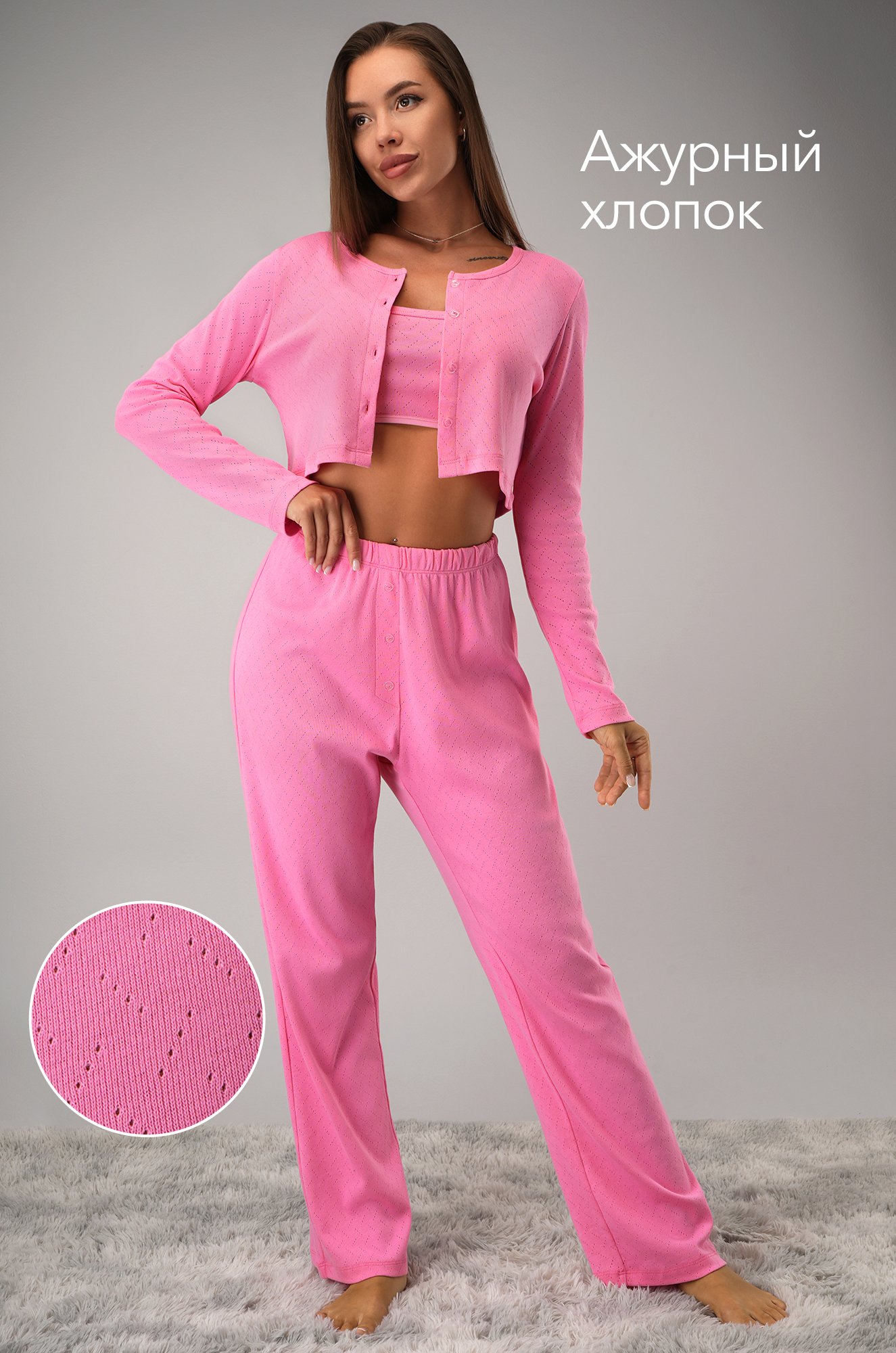— пижама 3-в-1: в наборе топ, кофта на пуговицах с длинными рукавами и брюки;