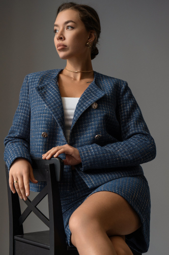 Жакет с длинным рукавом, без воротника, небольшие накладные кармашки подчеркивают стильный шик. Укороченная длина жакета добавляет образу современности и дерзости. Короткая юбка в обтяжку удачно акцентирует внимание на силуэте, создавая завершенный и утонченный образ, подходящий для повседневных и летних дней.