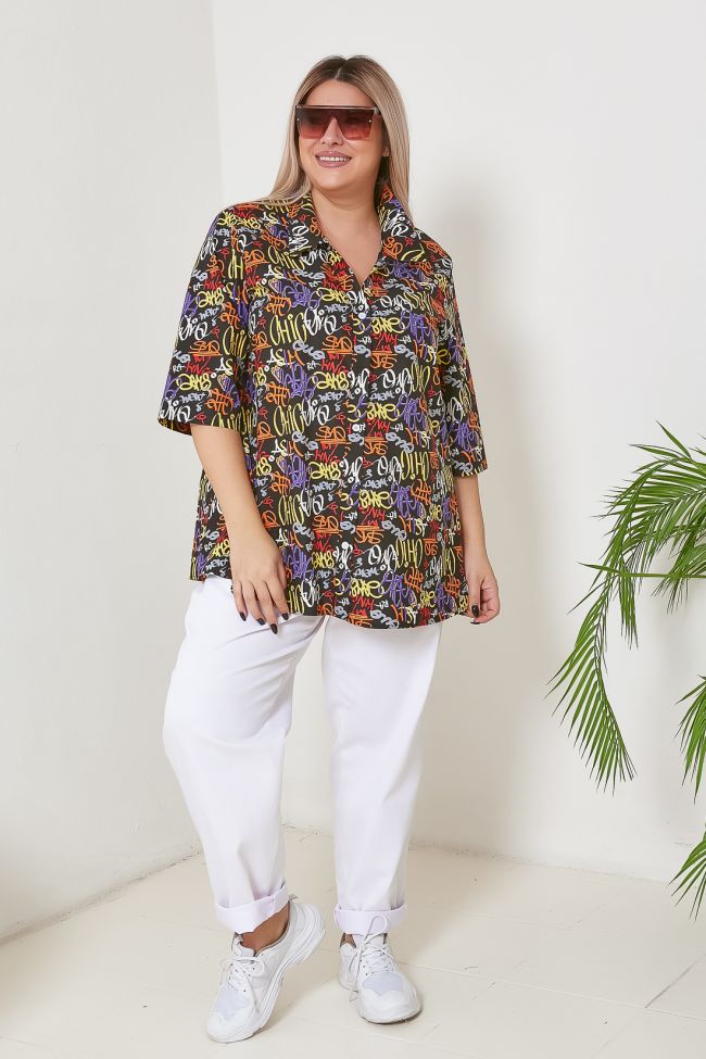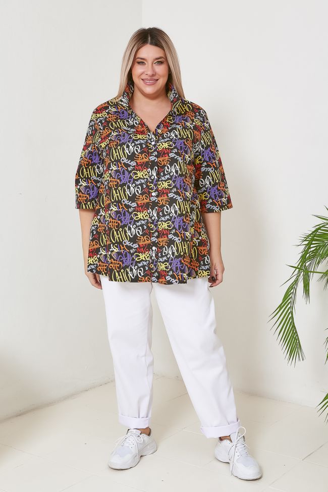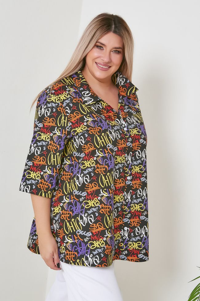 черный Рубашка свободного силуэта, из хлопковой ткани с ярким принтом . V-образный вырез горловины подчеркнут притачными планками и оформлен отложным воротником. По спинке притачная кокетка. Втачные рукава длиной чуть за локоть. Центральная застежка на петли-пуговицы. Низ ровный.