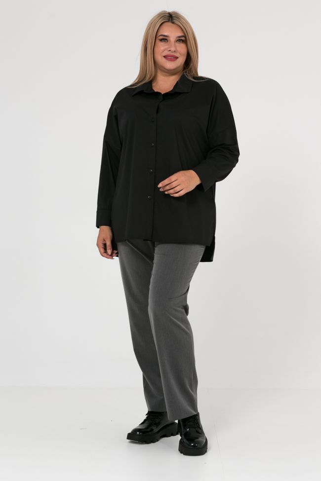 черный Рубашка прямого силуэта из однотонной сорочечной ткани. Горловина оформлена воротником рубашечного типа. По переду центральная застежка на петли и пуговицы. Линия плеча спущенная, рукав длинный, по низу дополнен манжетой. Низ разноуровневый, с удлиненной спинкой. Боковые швы дополнены разрезами.