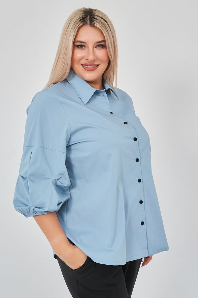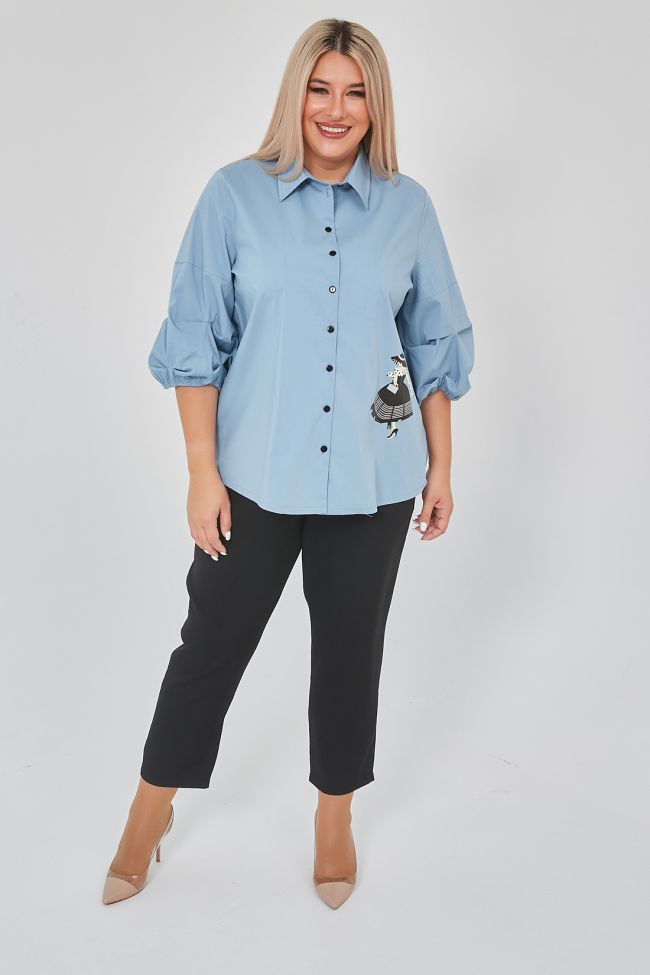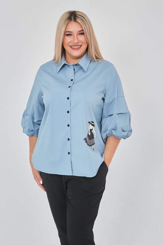 серо-голубой Оригинальная рубашка полуприлегающего силуэта из сорочечной ткани. Центральная застежка на петли и пуговицы. Горловина оформлена отложным воротником на притачной стойке. Втачной рукав длиной за локоть, нижняя часть рукава оформлена защипами создающими объем, по низу рукава резинка. Левая часть переда и спинка с оригинальным печатным рисунком. Низ изделия с актуальным закруглением. Интересное решение для создания эффектных образов.