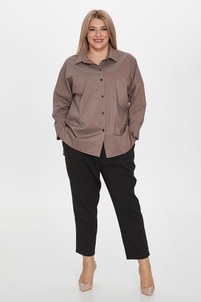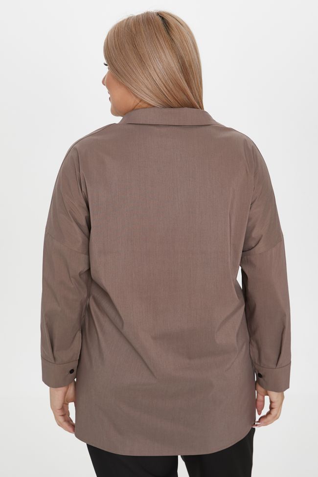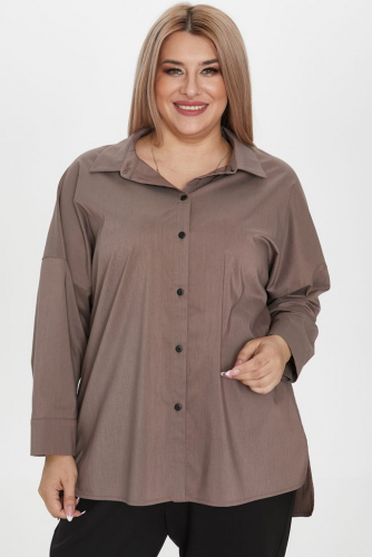 коричневый Рубашка прямого силуэта из сорочечной ткани с эффектом цветного перелива "шанжан". Горловина оформлена воротником рубашечного типа. По переду центральная застежка на петли и пуговицы. Линия плеча спущенная, рукав длинный, по низу дополнен манжетой. Низ разноуровневый, с удлиненной спинкой. Боковые швы дополнены разрезами.
