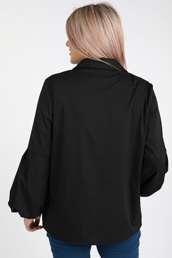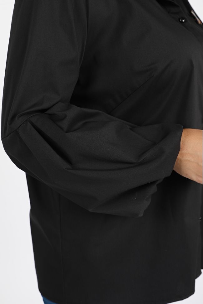 черный Стильная рубашка прямого силуэта из сорочечной ткани. Прилегание по груди за счет вытачек. Воротник - рубашечного типа с отрезной стойкой. По центру переда застежка на петли и пуговицы. Втачной длинный рукав (баллон) с подрезом выше локтя, дополнен объемной частью по низу. Слева оригинальный аксессуар в виде броши. Рубашка представлена с брюками  арт.1103
