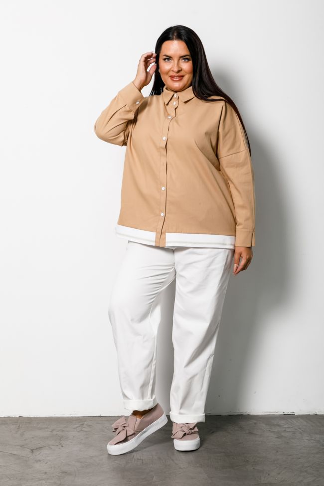 бежевый Стильная рубашка прямого силуэта из однотонной хлопковой джинсовой ткани. Горловина оформлена воротником рубашечного типа.  По переду планка по всей длине изделия, с застежкой на петли и пуговицы. Линия плеча спущенная, рукав длинный, по низу дополнен манжетой. Низ разноуровневый, с удлиненной спинкой. Перед по низу оформлен ярким подвязом, по спинке притачная манжета. Прекрасный вариант для создания интересных образов в сочетании с брюками и юбками.