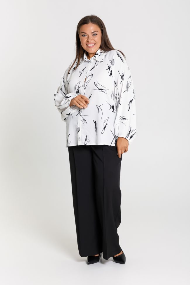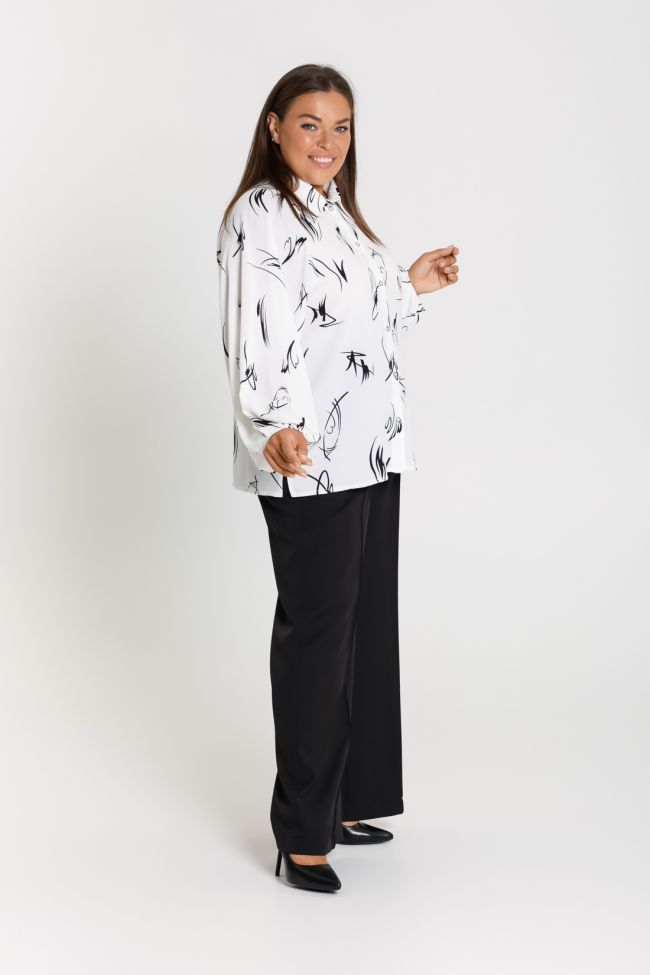белый Женская рубашка прямого силуэта из шелковой ткани. Перед с центральной застежкой на петли и пуговицы. Горловина оформлена воротником рубзашечного типа. Рукава покроя реглан, низ рукава типа фонарик, собран складками на резину. По низу боковых швов разрезы. Низ блузы прямой. Модель блузы дополнит повседневный и деловой гардероб.