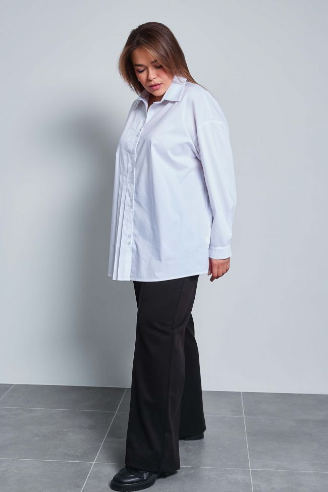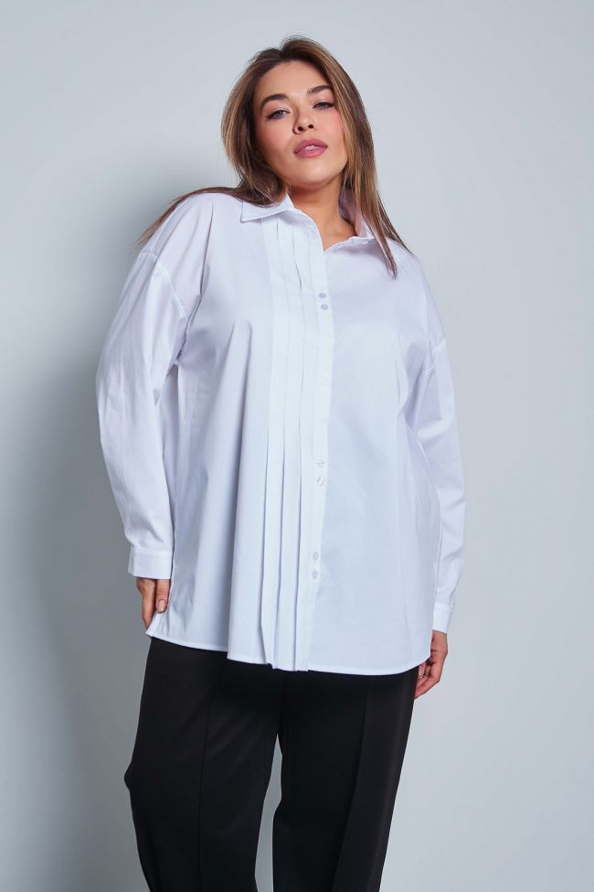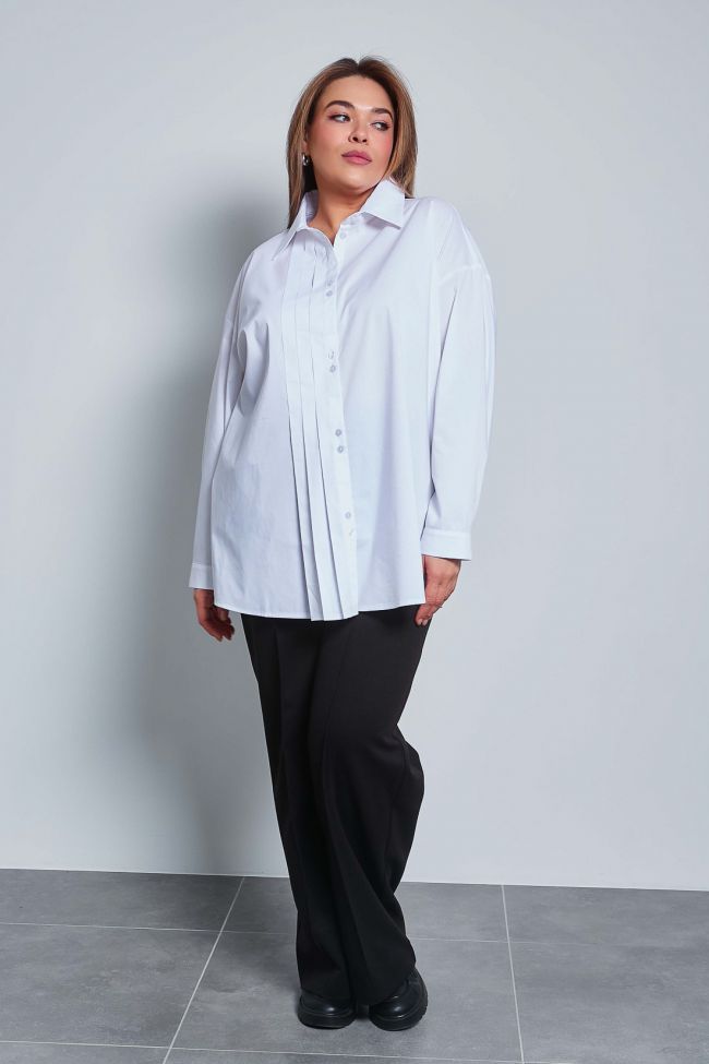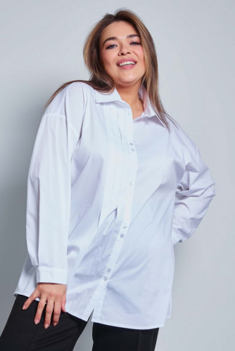 белый Стильная рубашка прямого силуэта из однотонной сорочечной ткани . Горловина оформлена воротником рубашечного типа. По правой части переда оттделка в виде застроченных складок , застежка центральная  на петли и пуговицы. Линия плеча спущенная, рукав длинный, по низу дополнен манжетой. Низ прямой. Оригинальное решение отделки делают эту модель актуальной и современной!