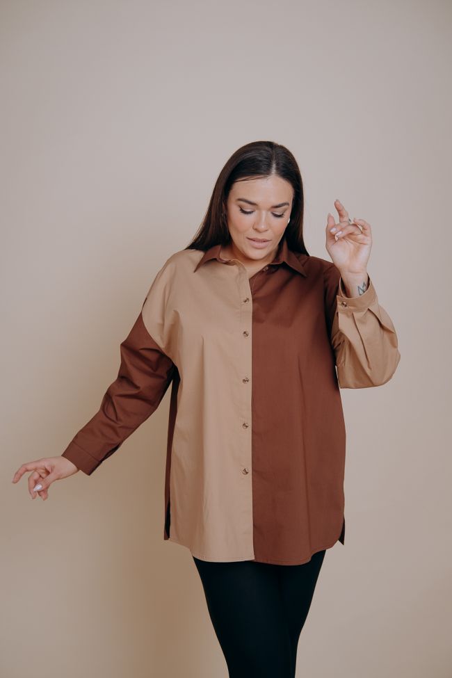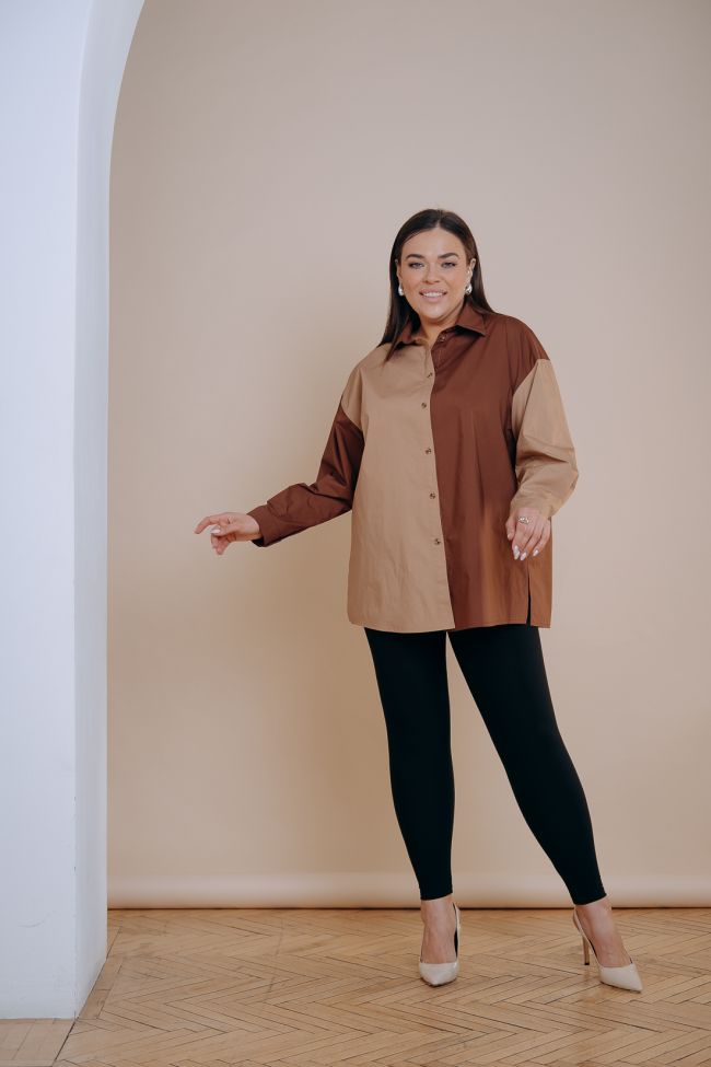 светло-коричневый Рубашка прямого силуэта из сорочечной ткани двух контрастных цветов. Горловина оформлена воротником рубашечного типа. По переду центральная застежка на петли и пуговицы. Линия плеча спущенная, рукав длинный, по низу дополнен манжетой. Низ прямой. Боковые швы дополнены разрезами по низу. Модель составит стильный комплект узким брюкам.