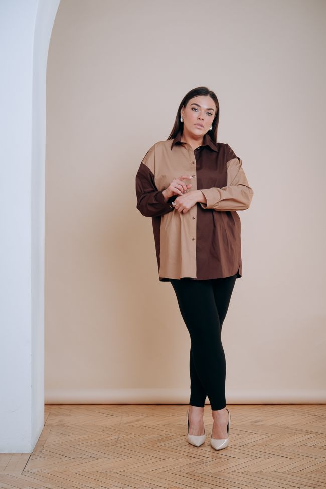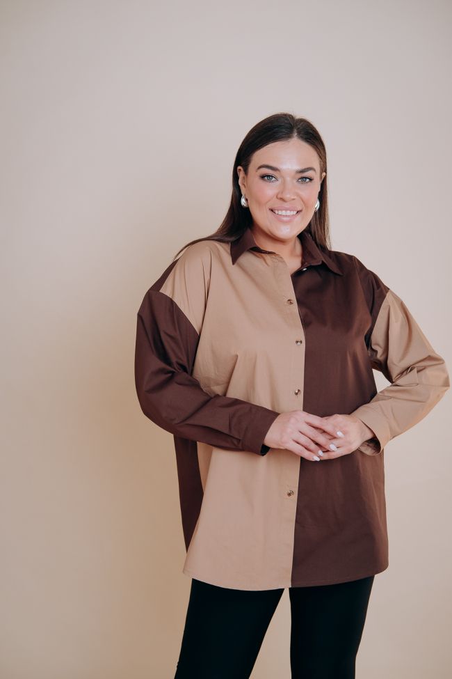 темно-коричневый Рубашка прямого силуэта из сорочечной ткани двух контрастных цветов. Горловина оформлена воротником рубашечного типа. По переду центральная застежка на петли и пуговицы. Линия плеча спущенная, рукав длинный, по низу дополнен манжетой. Низ прямой. Боковые швы дополнены разрезами по низу. Модель составит стильный комплект узким брюкам.