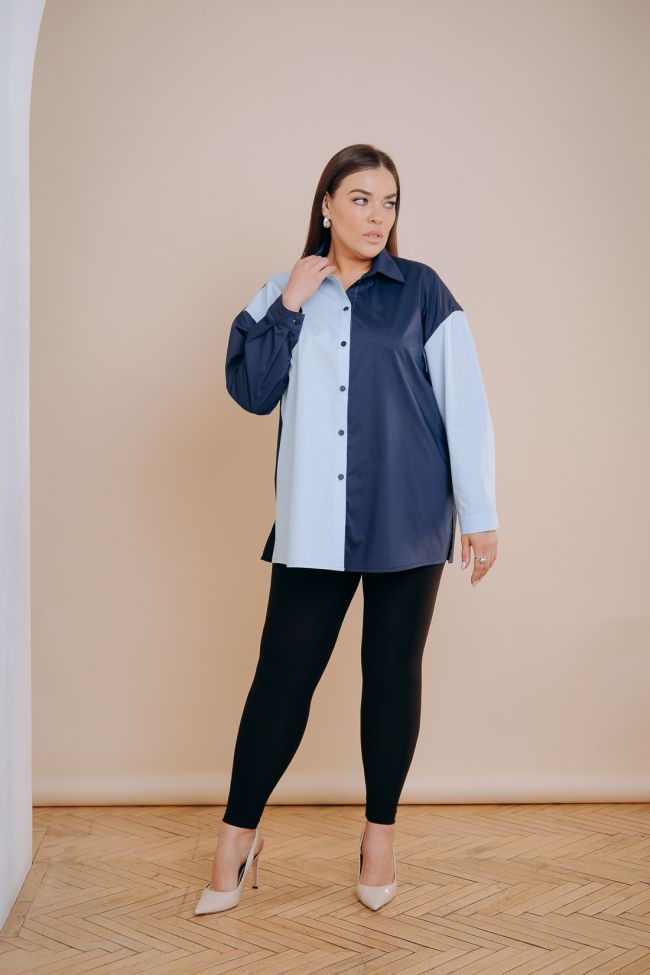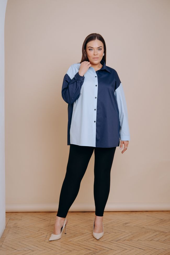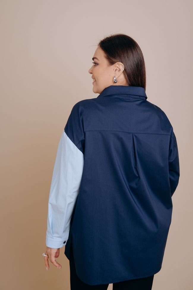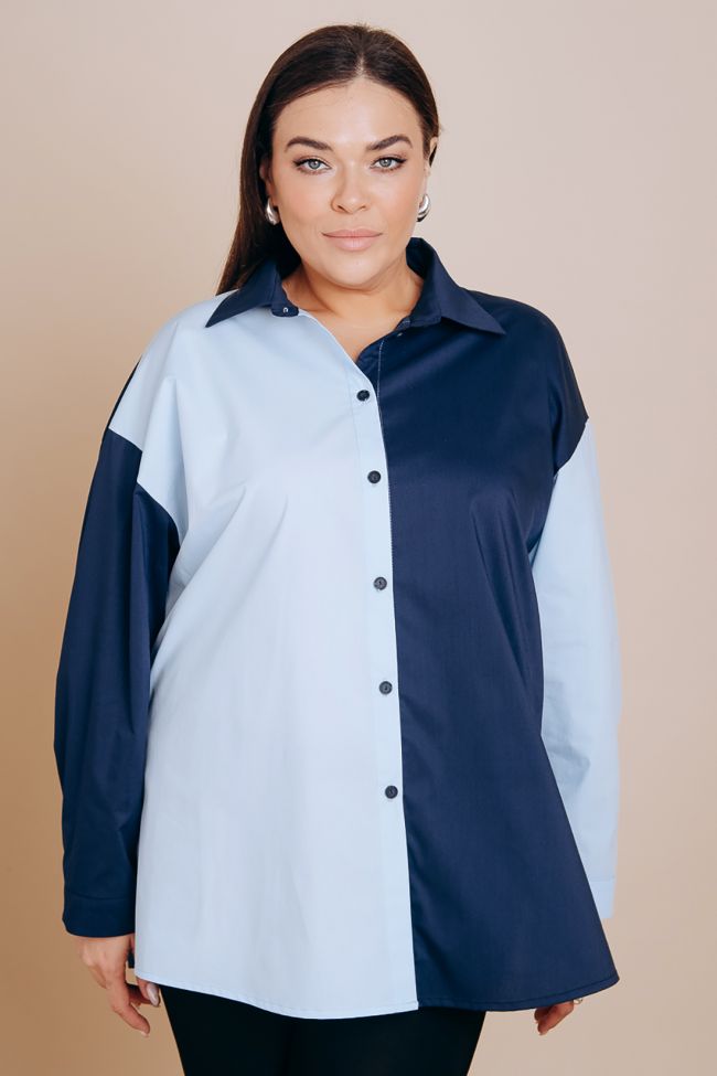 темно-синий Рубашка прямого силуэта из сорочечной ткани двух контрастных цветов. Горловина оформлена воротником рубашечного типа. По переду центральная застежка на петли и пуговицы. Линия плеча спущенная, рукав длинный, по низу дополнен манжетой. Низ прямой. Боковые швы дополнены разрезами по низу. Модель составит стильный комплект узким брюкам.