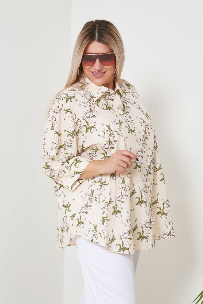 бежевый Рубашка свободного силуэта, из хлопковой ткани с принтом "цветы".  Горловина оформлена отложным воротником на притачной стойке. Центральная застежка на петли и пуговицы. По переду подрезной бочок с небольшой сборкой в области талии. По спинке притачная кокетка, дополнена сборкой по центру спинки. Втачные рукава 3/4, со сборкой по окату на приспущеной линии плеча, по низу дополнены манжетами с застежкой на петлю и пуговицу. Низ с актуальным закруглением.
